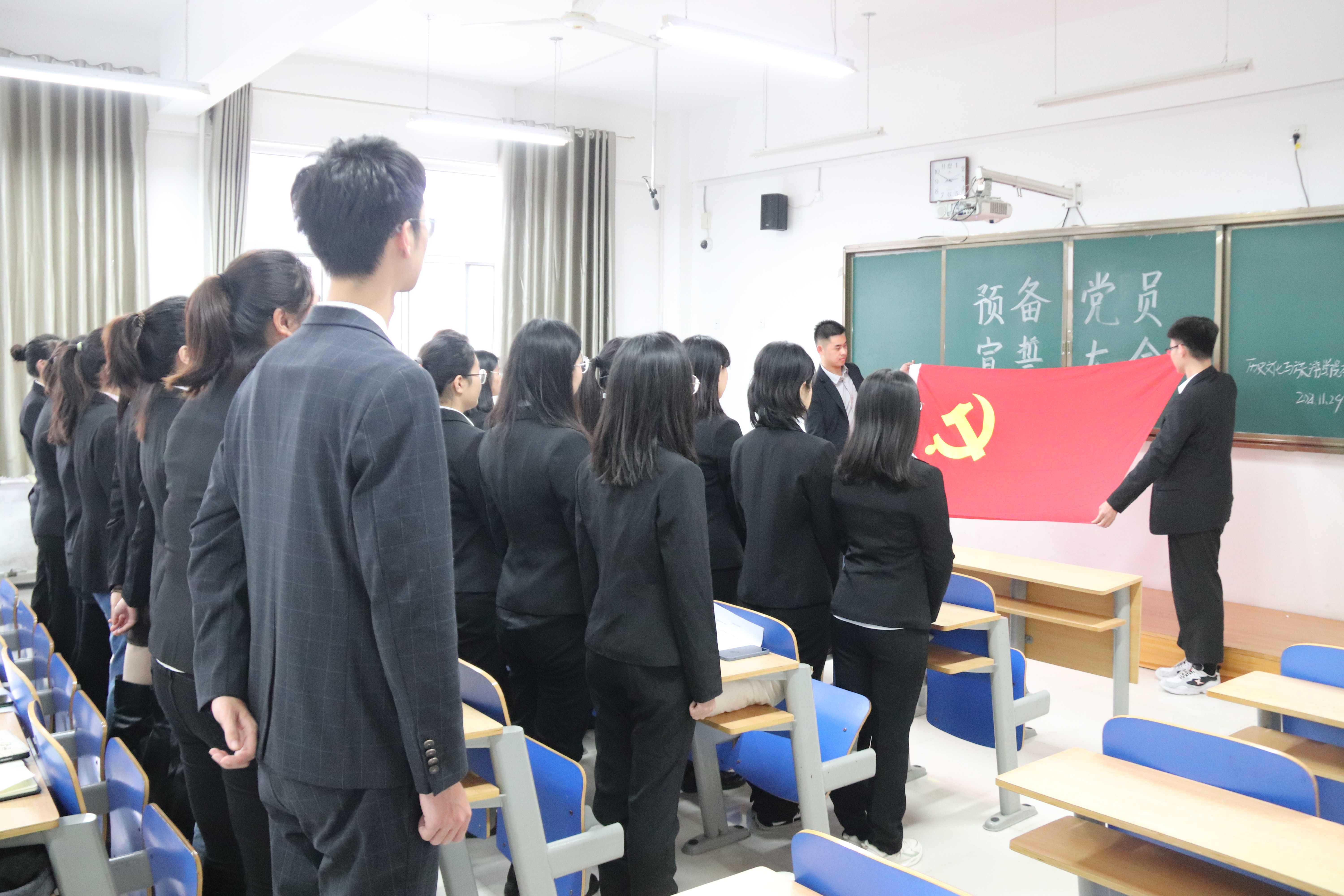 为进一步强化新发展党员的学习教育,增强新发展党员的责任感、使命感和归属感,11月29日,mk体育本科生党支部于6#A302教室对近期发展的29名预备党员开展了一场庄严的入党宣誓仪式。会议由本科生党支部书记薛天同志主持,辛超、巨国运老师出席了会议。 鲜红的党旗,醒目的主题,简而有力地为现场渲染出庄重的气氛。大会在雄壮的《国际歌》中拉开序幕。首先,薛天老师表达了对各位预备党员的殷切期望与美好祝福,并带领预备党员进行庄严神圣的宣誓仪式。“我志愿加入中国共产党……”29名新发展的预备党员在领誓人的带领下,高举右臂,紧握右拳,面对鲜红的党旗郑重宣誓。现场顿时响起了阵阵激昂的宣誓声,每位同学都用发自内心的声音来抒发对党忠诚的决心。随后,由预备党员代表李依帆、高睿同学发言,她们道出了在场预备党员们的心声,表达了自己会恪守在党旗下的诺言,更加严格的要求自己,并时刻保持共产党员所应具有的先进性和先锋模范作用。会议最后,薛天老师作总结发言,她强调,广老员工党员应铭记入党誓词,一心为党,忠诚于党,并在日后的学习生活中自觉担负起光荣的责任和使命,为党的伟大事业做出应有的贡献。 此次宣誓大会的召开,切实加强了公司党建工作的建设,不仅为党组织输入了新鲜血液,更为公司员工树立了学习的榜样,为更好地落实全心全意为人民服务的宗旨奠定了坚实的基础。(通讯员 和稀如 袁帅)