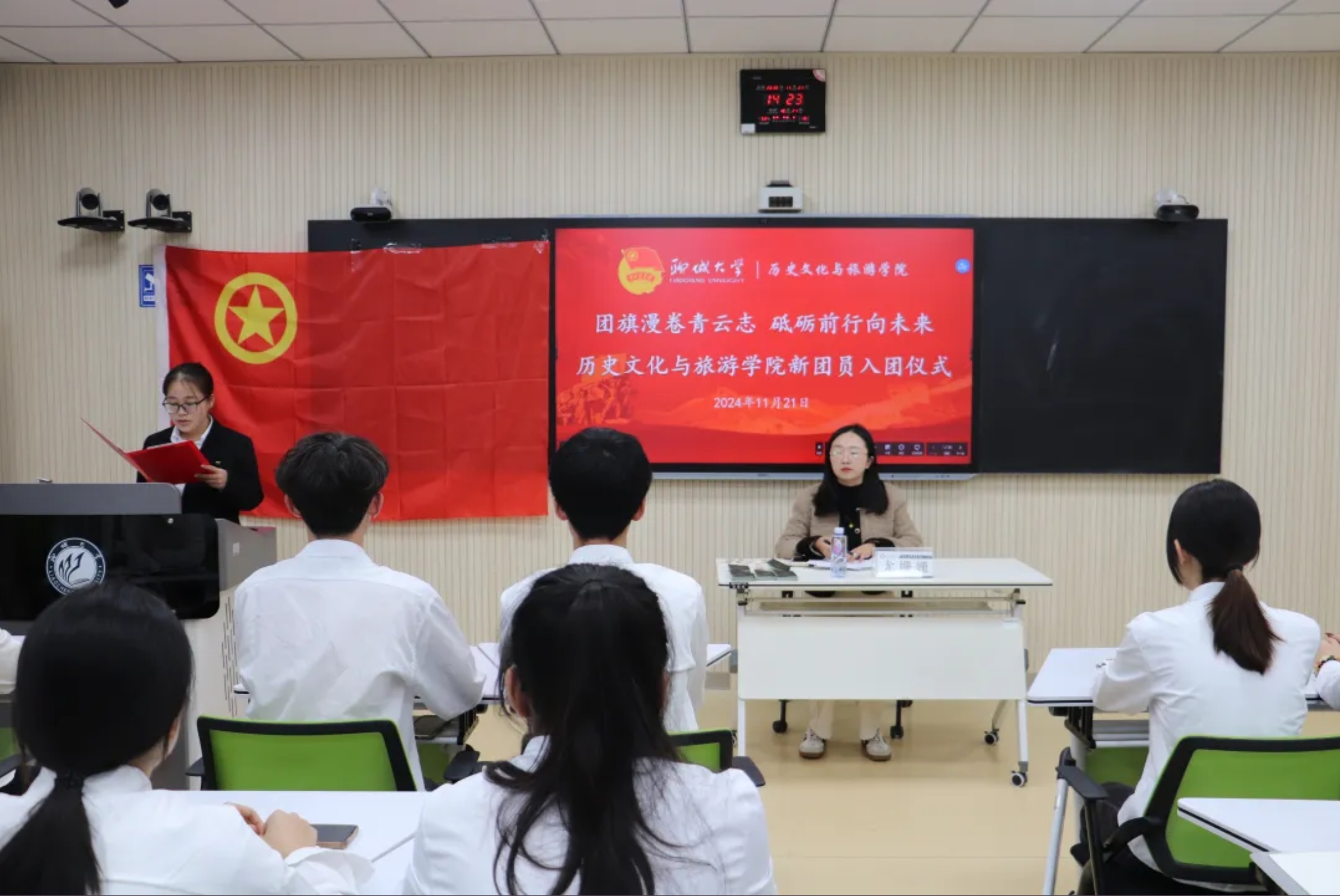 11月21日,公司于6#401教室举办2024年度新团员入团宣誓仪式。辅导员尤姗姗、优秀团员代表以及新发展团员参与此次新团员入团宣誓仪式。 随着国歌的响起,入团仪式拉开序幕。主持人宣读新团员名单,并带领全体新团员面向团旗庄严宣誓。经过团组织的培养考察,共有23名先进青年发展入团,尤姗姗为新团员佩戴团徽。 团员代表韩世聪带领新团员面向团旗进行庄严宣誓。新团员代表李萍激励广大青年团员树立远大理想,将个人理想融入于国家和民族的复兴事业中。 尤姗姗总结发言,她指出新发展团员应把爱国主义情怀融入到个人理想当中,以更高的标准严格要求自己。最后,全场齐声高唱《中国共青团团歌》,仪式在嘹亮歌声中圆满落下帷幕。 此次入团宣誓仪式,有利于培养青年的爱党爱国情怀,增强共青团员的责任感和使命感,以昂扬的姿态团结在团旗下,高扬理想的风帆,焕发青春的激情,向着新目标扬帆远航。 2023级7班韩丰竹:作为共青团员,我深知个人的成长与国家的命运紧密相连。在青春的征途上,我将继续秉持“携手并进,共筑梦想”的信念,与志同道合的伙伴们一起,用实际行动诠释青春的意义,为实现中华民族伟大复兴的中国梦贡献青春力量。让我们携手前行,不负时代,不负韶华,共同书写属于我们这一代人的辉煌篇章! 2023级6班裴一玮:当我站在仪式现场,目睹着鲜艳的旗帜,耳边回响着激昂的誓言,我感受到了一种强烈的使命感。我深知,入团不仅仅是一种荣誉,更是一种责任。我将以更加积极的态度投入到团队中,与大家一起学习、一起成长。我将努力提升自己的综合素质,为团队的发展贡献自己的力量。同时,我也将时刻铭记自己的团员身份,以身作则,传递正能量,为团队树立良好的形象。 (供稿:孙蕾 刘舒雅 摄影:陆雅馨 初审:刘舒雅 复审:张程程 终审:石晓晗)