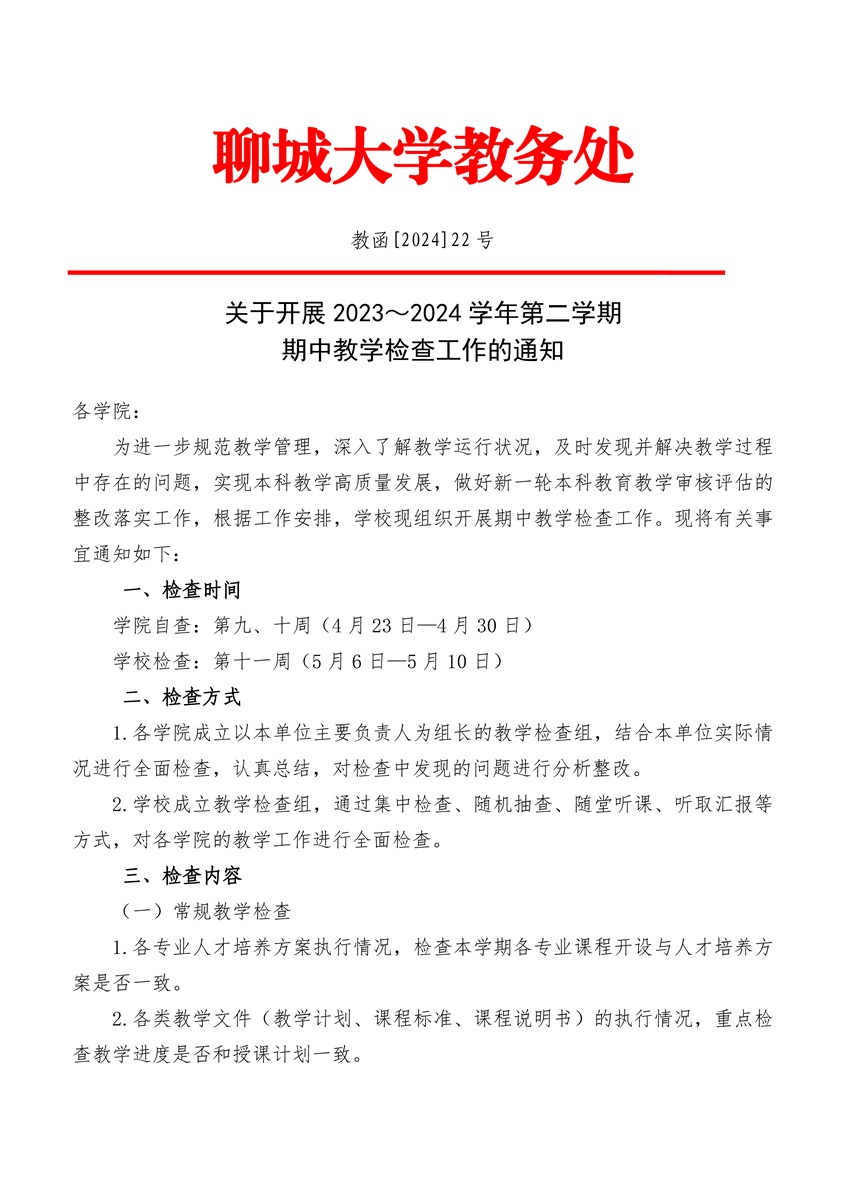关于开展2023-2024学年第二学期期中教学检查工作的通知