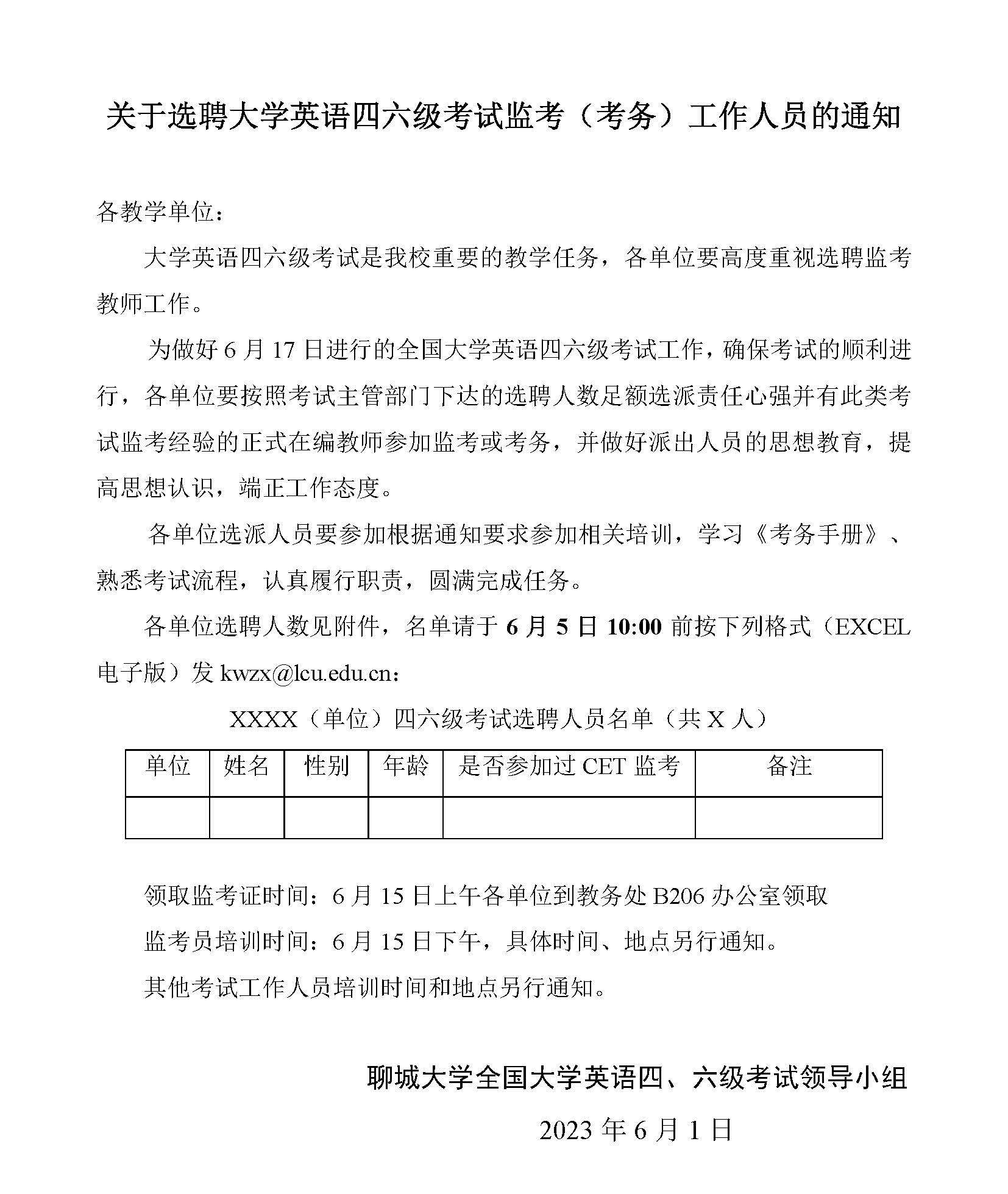 关于选聘大学英语四六级考试监考、考务工作人员的通知