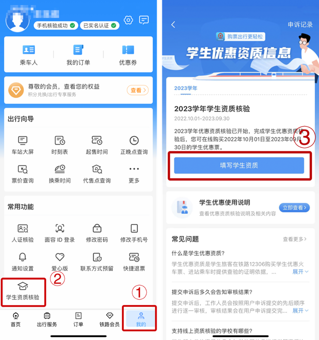关于2024级本科新生在线核验火车票优惠资质的通知 各公司: 根据《教育部办公厅 国铁集团办公厅关于进一步便利普通高等公司员工购买优惠火车票的通知》(教学厅函〔2023〕4号)精神,现将本科新生在线核验火车票优惠资质及员工证乘车区间填写要求等有关事项通知如下: 一、员工证乘车区间填写要求 各公司组织申请火车票优惠资质的员工填写《新生火车票优惠资质乘车区间统计表》(附件1,公司留存)、填写员工证家庭所在地及乘车区间,员工乘车区间应为公司所在地至家庭所在地,或父母实际居住地,公司所在地火车站填“聊城”,家庭所在地车站需按铁道购票部门规定标准的车站名称填写(以铁道部12306网站查询的站名为准),公司审核员工填报信息无误后,在员工证乘车区间页加盖公司公章。 二、在线优惠资质核验 员工在“铁路12306”APP员工专区填写个人信息及乘车区间,用于员工优惠资质核验;《新生火车票优惠资质乘车区间统计表》、员工证、“铁路12306”APP三处填写的乘车区间必须一致。 三、“铁路12306”APP员工专区填报指南 第1步:员工登录铁路12306手机客户端,右下角“我的”页面中点击“员工优惠资质核验”专区。如果当前用户是“已注册会员”或“已经在本机完成了人脸认证”则可直接点击“填写员工资质”核验员工资质信息。 第2步:根据员工证信息如实填写公司所在地车站、家庭所在地车站(申请时准确填写个人信息和与员工证上一致的优惠乘车区间!)、预计毕业年份等信息后,点击提交。提交员工资质信息后,若信息与学信网相匹配,后台将于3天内自动审核通过。 教 务 处 2024年9月24日 教育部办公厅 国铁集团办公厅关于进一步便利普通高等公司员工购买优惠火车票的通知 http://www.moe.gov.cn/srcsite/A15/s7063/202306/t20230605_1062839.html
