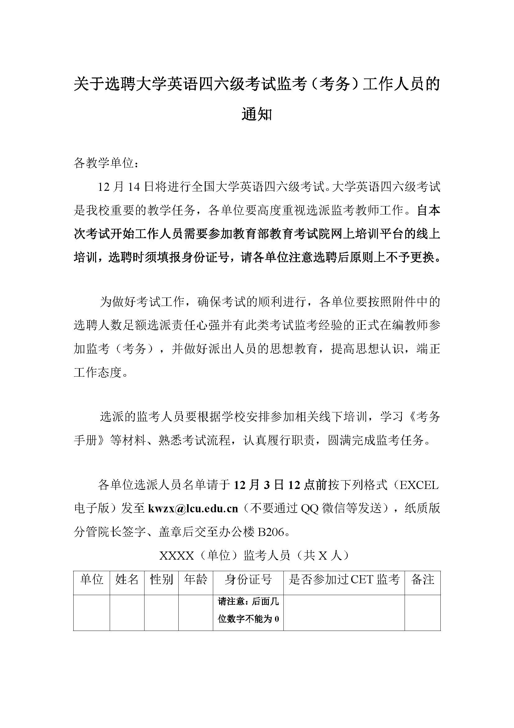 关于选聘大学英语四六级考试监考、考务工作人员的通知