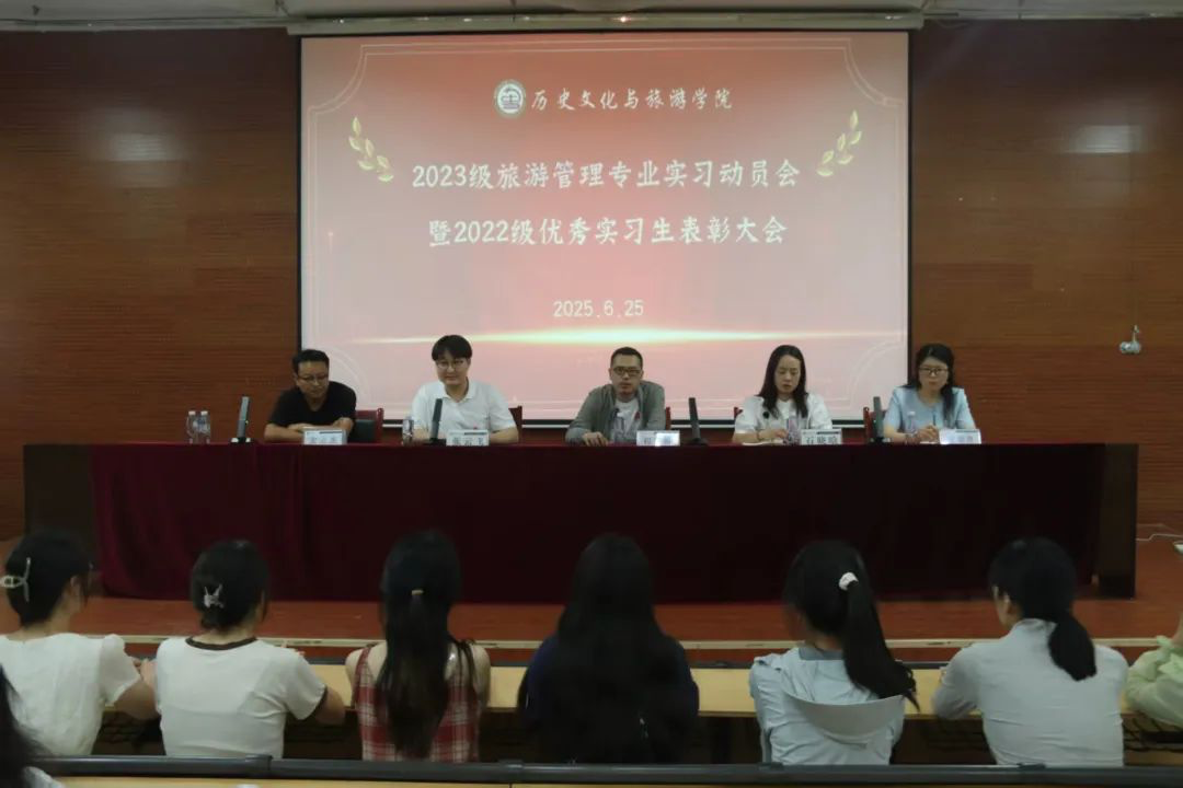 为扎实推进旅游管理专业实习工作,提升员工实践能力与职业素养,助力23级学子顺利开启实习之旅,6月25日,公司于6#106举办23级旅游管理专业实习动员会。公司团委书记石晓晗、旅游管理专业系主任张云飞、带教老师代表宋立杰、程俊峰、耿瑞琴及全体23级旅游管理专业员工参与会议。 会议伊始,由公司老师为表现优异的22级旅游管理专业实习生颁发荣誉证书,激励新一批实习生以榜样为标杆,在实习中奋勇争先。随后,带教老师代表上台发言,老师着重强调实习期间的安全与纪律问题,要求同学们务必严格遵守实习单位规章制度,在酒店服务、景区实践等工作场景中,时刻将安全放在首位,规范操作流程,保障自身及游客安全。同时,老师们叮嘱大家要以严谨的态度对待实习工作,服从单位安排,用实际行动展现公司学子的专业素养与精神风貌。 在动员讲话中,张云飞点明实习对旅游管理专业员工的重要意义,鼓励同学们在实习中实现从员工到职场人的身份转变,主动学习行业前沿知识与技能,将课堂所学融入实践。张云飞还帮助员工结合当前旅游行业就业形势,为同学们剖析实习与职业规划的紧密联系,建议大家在实习中找准自身定位,合理规划职业方向。石晓晗也强调,实习是理论与实践结合的关键契机,希望同学们明确实习目标,积极与带教老师、实习单位沟通交流,主动适应新环境,积累宝贵经验,为未来职业发展筑牢根基,同时,她也勉励全体实习生珍惜实习机会,发扬吃苦耐劳精神,在实践中锤炼本领,以饱满的热情和高度的责任感投入到旅游服务工作中。 此次动员大会的成功举办,不仅总结了22级旅游管理专业实习的成果,为23级旅游管理专业员工的实习工作指明方向,还为实习工作的顺利开展奠定了坚实基础。 (供稿:郭俊霞 摄影:于舒然 初审:于舒然 复审:张程程 终审:尤姗姗)