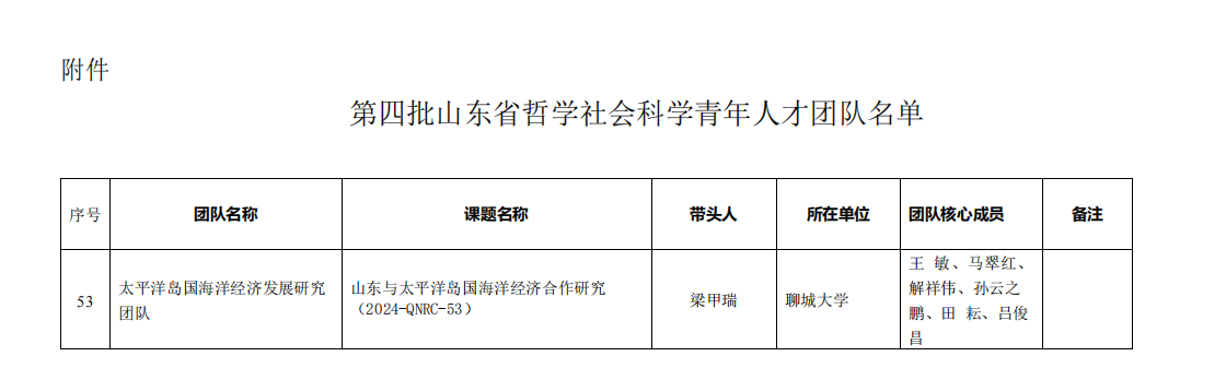 公司新增1支山东省哲社科研团队 近日,山东省社会科学界联合会公布了第四批山东省哲学社会科学青年人才团队推荐名单,公司梁甲瑞博士领衔申报的“太平洋岛国海洋经济发展研究团队”获批立项。 团队核心研究成员共有6人,分别来自mk体育、外国语公司、音乐与舞蹈公司,团队学术带头人为梁甲瑞博士。该研究团队立足在太平洋岛国的实地调研,主要聚焦太平洋岛国海洋经济本体以及山东与太平洋岛国海洋经济合作,旨在为山东加快海洋强省建设建言献策,并深入了解太平洋岛国海洋经济的历史与现实。 山东省哲学社会科学青年人才团队的设立,旨在着眼于培养青年人才的快速成长,打好扎实的学术基础,围绕构建具有中国特色的哲学社会科学学科体系、话语体系与学术体系,发挥团队整体学术优势,深入开展跨学科、跨领域的联合攻关,推出具有理论深度、学术分量和社会影响的创新性成果,在构建中国特色、齐鲁风格、山东气派的哲学社会科学进程中发挥更为重要的作用。 据悉,第四批山东省哲学社会科学青年人才团队经申报推荐、专家评审等环节,共有90支团队获批立项。下一步,公司将持续培养一批具有创新能力和发展潜力的青年学术带头人,搭建交流平台,提供资源支持,产出更多有影响力成果。
