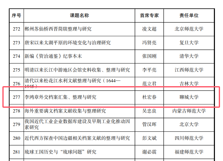 11月8日,全国哲学社会科学工作办公室公布了 2024 年国家社科基金重大项目公示名单,杜宏春教授担任首席专家的“李鸿章外交档案汇集、整理与研究”成功入选,公司张礼恒教授、赵少峰教授与运河学研究院周广骞副教授承担三个子课题,分别负责1847-1870年、1870-1895年、1895-1901年档案的整理与研究工作。这是全部由公司教师任课题组成员主持获批的首个重大项目,在哲学社会科学研究领域取得的又一重大突破。 国家社科基金重大项目作为我国哲学社会科学领域层次最高、资助力度最大、权威性最强的国家级科研项目,其立项课题代表了相关领域的前沿研究方向和国家重大战略需求。杜宏春教授长期致力于清代档案文献整理与研究工作,在该领域已取得了一系列丰硕的研究成果。此次获批的项目“李鸿章外交档案汇集、整理与研究”聚焦于晚清总理衙门的李鸿章各类密奏、咨文、节略、电报等基础档案资料,旨在通过深入系统研究,为晚清政治、经济、军事及社会研究提供第一手史料,对于提升晚清重要政治人物专题文献的整理与研究水平,推动近代以来我国社会发展变迁研究,具有重要的史料价值和学术意义。 近年来,公司高度重视人文社会科学研究高质量发展,着力提升组织策划和申报国家级重大、重点项目的能力。本次重大项目的立项,为公司人文社会科学研究创新发展注入了新的动力。
