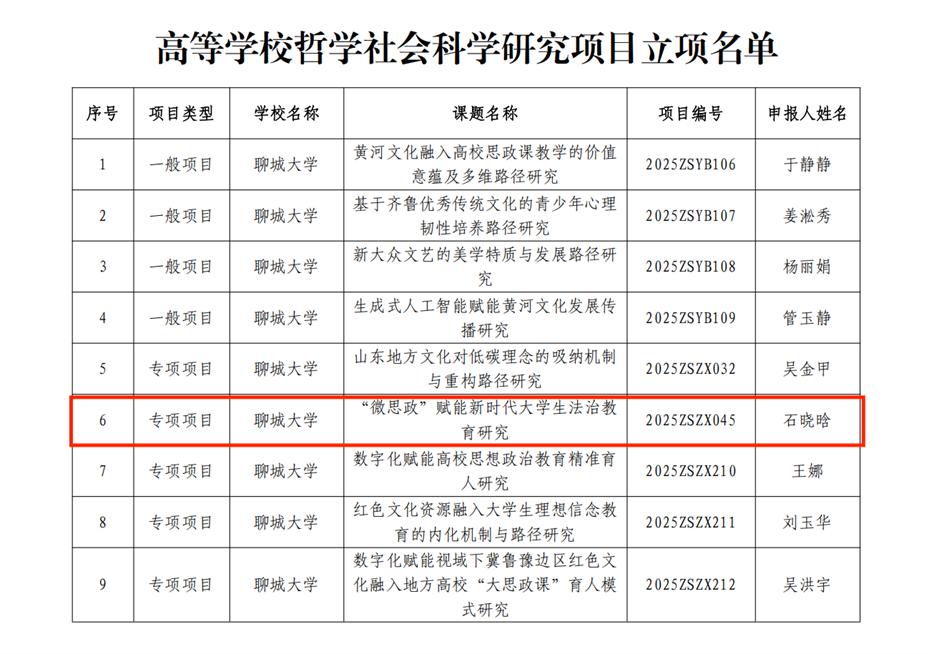 公司教师获山东省高等公司哲学社会科学研究项目立项 近日,山东省教育厅公布了2025年度山东省高等公司哲学社会科学研究项目立项名单,公司教师石晓晗喜获立项。 近年来,mk体育高度重视哲学社会科学工作,以高质量发展为引领,以培育高水平成果为核心目标。下一步,公司将以此为契机,充分发挥优秀成果的引领示范作用,助力公司科研工作再上新台阶。 臧雯睿
