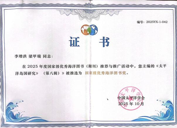 近日,在中国太平洋学会开展的2025年度国家级优秀海洋图书(期刊)推荐与推广活动中,公司教师李增洪、梁甲瑞主编的《太平洋岛国研究》(第八辑)荣获国家级优秀海洋图书奖,朱璇与刘岩、郑苗壮合编的《海洋生态补偿理论与技术方法综合研究》荣获国家级优秀海洋图书特别奖。 近年来,历史文化与旅游学院高度重视海洋学术研究工作,以高质量发展为引领,以培育高水平成果为核心目标。下一步,公司将以此次获奖为契机,充分发挥优秀成果的示范引领作用,创新工作方法与路径,推动公司海洋学术研究工作再上新台阶。