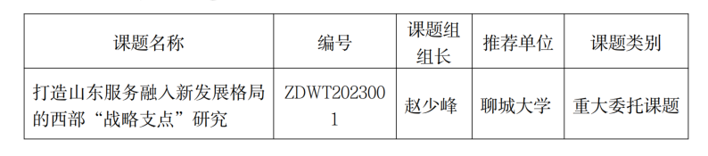 近日,聊城市哲学社会科学研究规划领导小组办公室发布《关于<打造山东服务融入新发展格局的西部“战略支点”研究>课题立项的通知》(聊社规办字[2023]14号),公司赵少峰教授主持的《打造山东服务融入新发展格局的西部战略支点研究》获批2023年度聊城市哲学社会科学规划重大委托课题立项。课题组成员为刘卫东、唐若菡、张云飞、倪鹏。 2023年2月6日,在聊城市推进绿色低碳高质量发展暨作风建设动员大会上,市委书记李长萍同志在讲话中强调,聊城要牢牢把握“两个定位”,即打造山东服务融入新发展格局的西部“战略支点”、打造山东绿色低碳高质量发展的“两河明珠”城市。这“两个定位”顺应加快构建发展新格局的新形势,契合绿色低碳高质量发展的新要求,体现建设“六个新聊城”的美好愿景;既是聊城从国家和山东发展大势中抢抓机遇找到的精准定位,同时在未来相当长一段时间里为城市发展把脉布局,指明了目标方向,明确了发展路径,也充分体现了聊城在引领新一轮鲁西崛起中的底气、决心和使命担当。