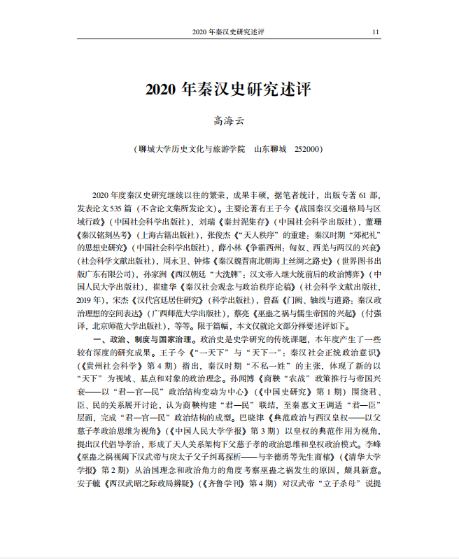 摘要:2020年度秦汉史研究继续以往的繁荣,成果丰硕,据笔者统计,出版专著61部,发表论文535篇(不含论文集所发论文)。主要论著有王子今《战国秦汉交通格局与区域行政》(中国社会科学出版社),刘瑞《秦封泥集存》(中国社会科学出版社),董珊《秦汉铭刻丛考》(上海古籍出版社),张俊杰《“天人秩序”的重建:秦汉时期“郊祀礼”的思想史研究》(中国社会科学出版社),薛小林《争霸西州:匈奴、西羌与两汉的兴衰》(社会科学文献出版社),周永卫、钟炜《秦汉魏晋南北朝海上丝绸之路史》(世界图书出版广东有限公司),孙家洲《西汉朝廷“大洗牌”:汉文帝入继大统前后的政治博弈》(中国人民大学出版社),崔建华《秦汉社会观念与政治秩序论稿》(社会科学文献出版社,2019年),宋杰《汉代宫廷居住研究》(科学出版社),曾磊《门阙、轴线与道路:秦汉政治理想的空间表达》(广西师范大学出版社),蔡亮《巫蛊之祸与儒生帝国的兴起》(付强译,北京师范大学出版社),等等。限于篇幅,本文仅就论文部分择要述评如下。 基金资助:山东省社会科学规划项目“东汉儒生与文吏互动关系研究”(21CLSJ03);mk体育科研基金平台项目“东夷文化与齐、鲁学之分”成果之一。 该文刊发于《中国史研究动态》2021年第6期。