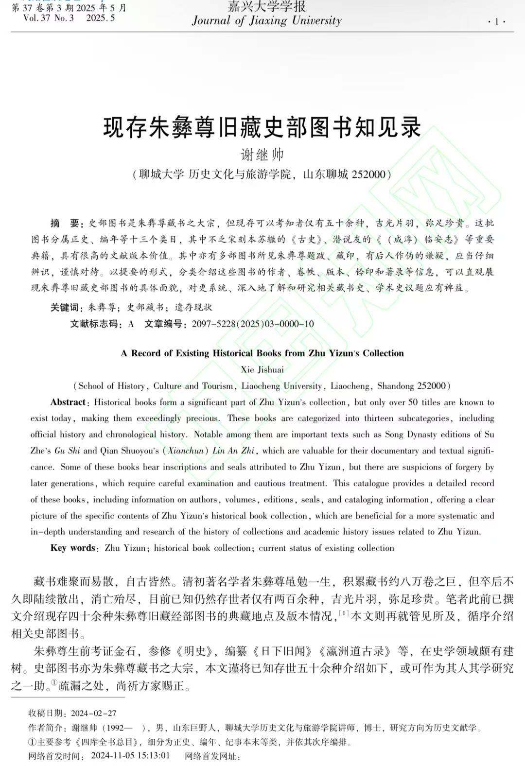 学术简报丨《现存朱彝尊旧藏史部图书知见录》