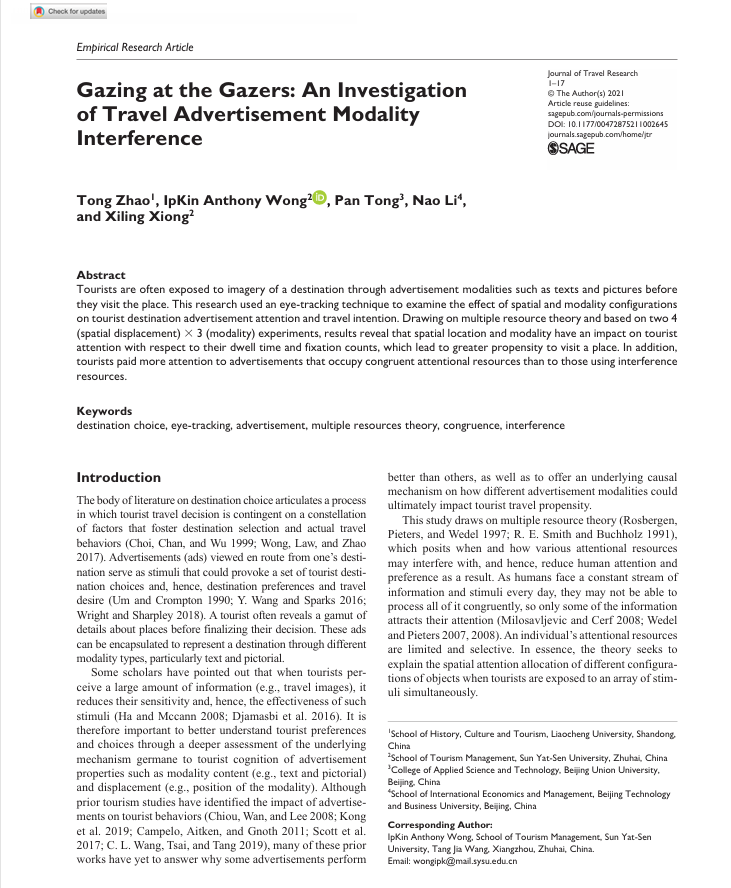 摘要:Tourists are often exposed to imagery of a destination through advertisement modalities such as texts and pictures before they visit the place. This research used an eye-tracking technique to examine the effect of spatial and modality configurations on tourist destination advertisement attention and travel intention. Drawing on multiple resource theory and based on two 4 (spatial displacement) × 3 (modality) experiments, results reveal that spatial location and modality have an impact on tourist attention with respect to their dwell time and fixation counts, which lead to greater propensity to visit a place. In addition, tourists paid more attention to advertisements that occupy congruent attentional resources than to those using interference resources. 关键词:destination choice;eye-tracking;advertisement;multiple resources theory;congruence