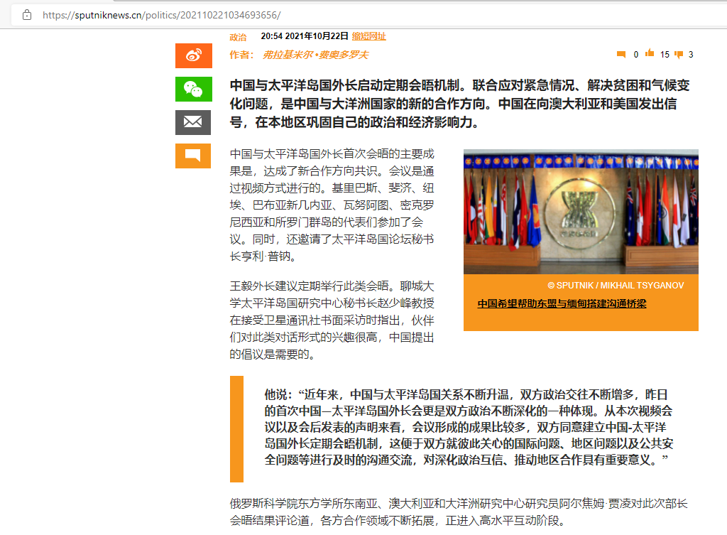 10月21日,首届中国-太平洋岛国外长会议以视频方式举行,会议由国务委员兼外长王毅主持,同中国建交的太平洋岛国外长出席活动。与会各方围绕中国同太平洋岛国关系、抗疫及各领域交流合作、国际地区合作等议题深入交换意见。 针对首届中国-太平洋岛国外长会议,太平洋岛国研究中心秘书长赵少峰教授接受了俄罗斯卫星通讯社采访。赵少峰认为,大洋洲国家与中国搞合作,可找到解决本国问题的可靠方式,包括应对疫情和其它紧急状况,消除贫困和解决气候变化问题。本次部长会晤期间,制定了新领域发展合作路线图。 同时接受采访的还有俄罗斯科公司东方学所东南亚、澳大利亚和大洋洲研究中心研究员阿尔焦姆·贾凌。(通讯员 太平洋岛国研究中心 梁婷 韩田田) 新闻链接:https://sputniknews.cn/politics/202110221034693656/