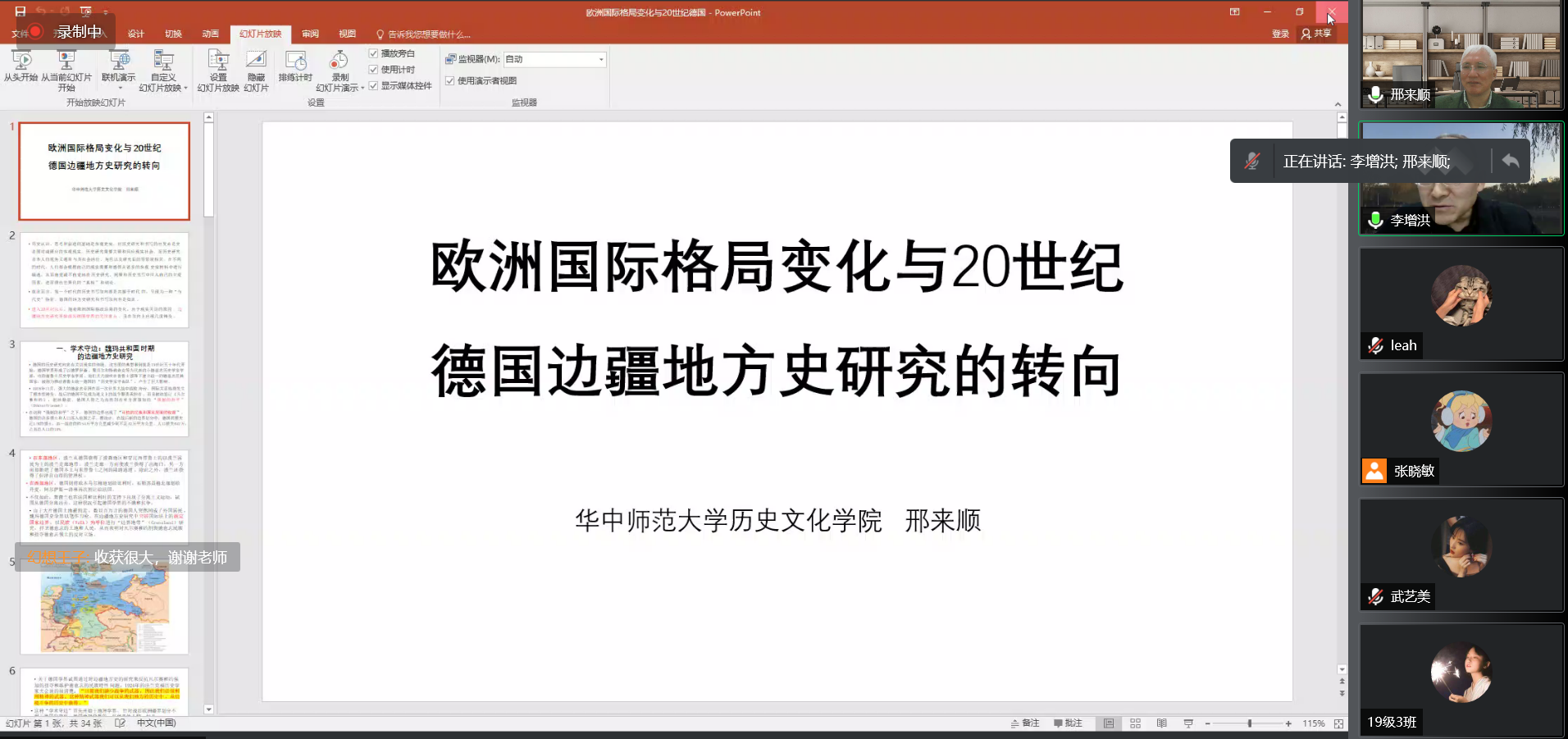 11 月29日晚,华中师范大学历史文化公司教授、博士生导师邢来顺教授应邀做客聊大讲坛为公司师生作了题为《欧洲国际格局变化与20世纪德国边地史研究的转向》的线上学术报告会,本次会议由李增洪经理主持,公司部分师生听取了报告。 邢教授指出,进入20世纪以后,随着欧洲国际政治格局的变化,边疆地方史研究开始成为德国学界关注的重点,且在取向上出现几度转变。他把这几次转变分为三个阶段进行讲述,第一个阶段的主题是:“学术守边:魏玛共和国时期的边疆地方史研究”。邢教授认为,这个阶段在“民族”的特殊视角下,边疆地方史研究的明显特点是确认并强化跨边境地方的德意志民族特性认同。魏玛共和国时期通过凸显地方的德意志特性来凝聚德意志人民族认同和捍卫领土斗争的学术利器。第二个阶段的主题是:“学术扩边:第三帝国时期的边疆地区史研究与德国对外扩张”。邢教授指出,纳粹上台后,德国史学界为希特勒的对外扩张提供学术支持,因此德国的边疆地方史研究转向“学术扩边”,为日后德国的重新扩张和征服预备托辞。第三个阶段的主题是:“文化溯边:欧洲一体化时代的德国边疆地方史研究”。邢教授强调,二战之后,德国由于全新的国际国内政治形势需要德国史学界从历史视角做出诠释,因此拥有共同的文化、社会和地理等空间要素地区成为关注对象。德国史学界在这一阶段更希望在摆脱民族国家疆界的束缚,在“地区史”和“空间史”范式下挖掘曾经的德意志地区的文明因子。最后邢教授总结,德国史学界在20世纪边疆地方史研究方面对国际时局的变化表现出极度的敏感和现实关切,虽数度转向,但基于德意志民族利益和政治需要的现实关切始终未变。 会议结尾,邢教授细致耐心地解答了师生的疑惑。通过本次讲座,公司师生加深了对20世纪欧洲的国际格局变化以及德国边地史研究的理解,深刻认识到历史认识、思考和叙述的基础是客观史实,历史研究不仅要需要关照和回应现实社会,还会与研究者本人的社会地位、角色以及研究目的紧密相关。 专家简介: 邢来顺,华中师范大学历史文化公司教授、博士生导师,享受国务院政府特殊津贴专家、国家社科基金学科规划评审专家,兼任中国德国史研究会名誉会长、中国世界近代现代史研究会副会长、湖北省世界史学会会长等职。 (通讯员:张丽霞)