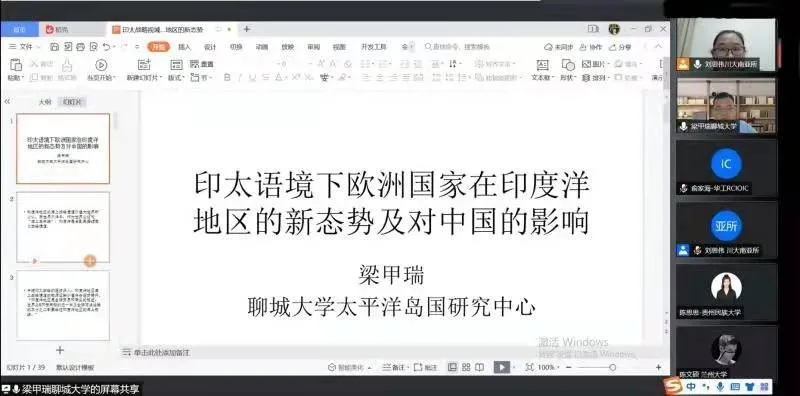 2021年12月22日,由四川大学南亚研究所与华南理工大学印度洋岛国研究中心联合举办的“百年大变局下印度洋大棋局”学术论坛通过线上方式顺利举行。来自中国现代国际关系研究院、上海国际问题研究院、四川大学、华南理工大学、湘潭大学、mk体育等高校和科研院所的专家学者围绕美国、印度、澳大利亚、欧盟、印度洋岛国等国家和地区视角对百年大变局下印度洋大棋局展开深入研讨。 mk体育太平洋岛国研究中心研究员、学术研究部主任、海洋治理研究所所长梁甲瑞做了《印太语境下欧洲国家在印度洋地区的新态势及对中国的影响》的学术报告。他首先从印太语境下,探讨了欧盟、德国、法国在印度洋地区的新态势,从海洋安全维度和海洋健康维度,分析了其对中国连接印度洋地区蓝色经济通道的影响,并尝试提出中国构建连接印度洋地区蓝色经济通道的路径。