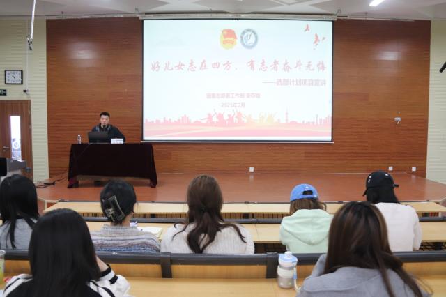 为积极响应国家号召,扎实推进老员工志愿服务西部计划宣传工作,引导同学们积极投身基层,建设美丽西部,3月22日,我院于6#A106教室举办2025年西部计划宣讲会。本次宣讲会由校西部计划项目办、校团委志愿工作部部长荣存福担任主讲人,我院团委书记石晓晗及2021级应届毕业生参加会议。 荣存福紧扣“奉献、友爱、互助、进步”的志愿精神展开系统解读,详细阐释西部计划的中央与地方财政协同保障机制——志愿者在岗期间将享受社会保险全覆盖、住宿交通补贴等支持,服务期满后还可申请学费补偿或助学贷款代偿。同时,他以公司优秀志愿者事迹为例,生动展现西部计划的实践价值。荣存福建议同学们登录全国西部计划官网完成预报名,并承诺校项目办将提供“全流程”指导,包括政策咨询、技能培训及岗前实训。他鼓励同学们用一年的时间,做一件终生难忘的事,用行动证明“西部的广阔天地是青年成长的沃土,基层的奋斗足迹是青春最美的勋章”。 本次活动的顺利举办,使同学们了解到西部计划的内容与政策,有利于激发同学们服务西部、建设祖国的热情,推动更多青年将个人理想融入国家发展大局,在服务西部的实践中书写无悔青春。 (供稿:罗佩华 摄影:罗佩华 初审:于舒然 复审:张程程 终审:尤姗姗)