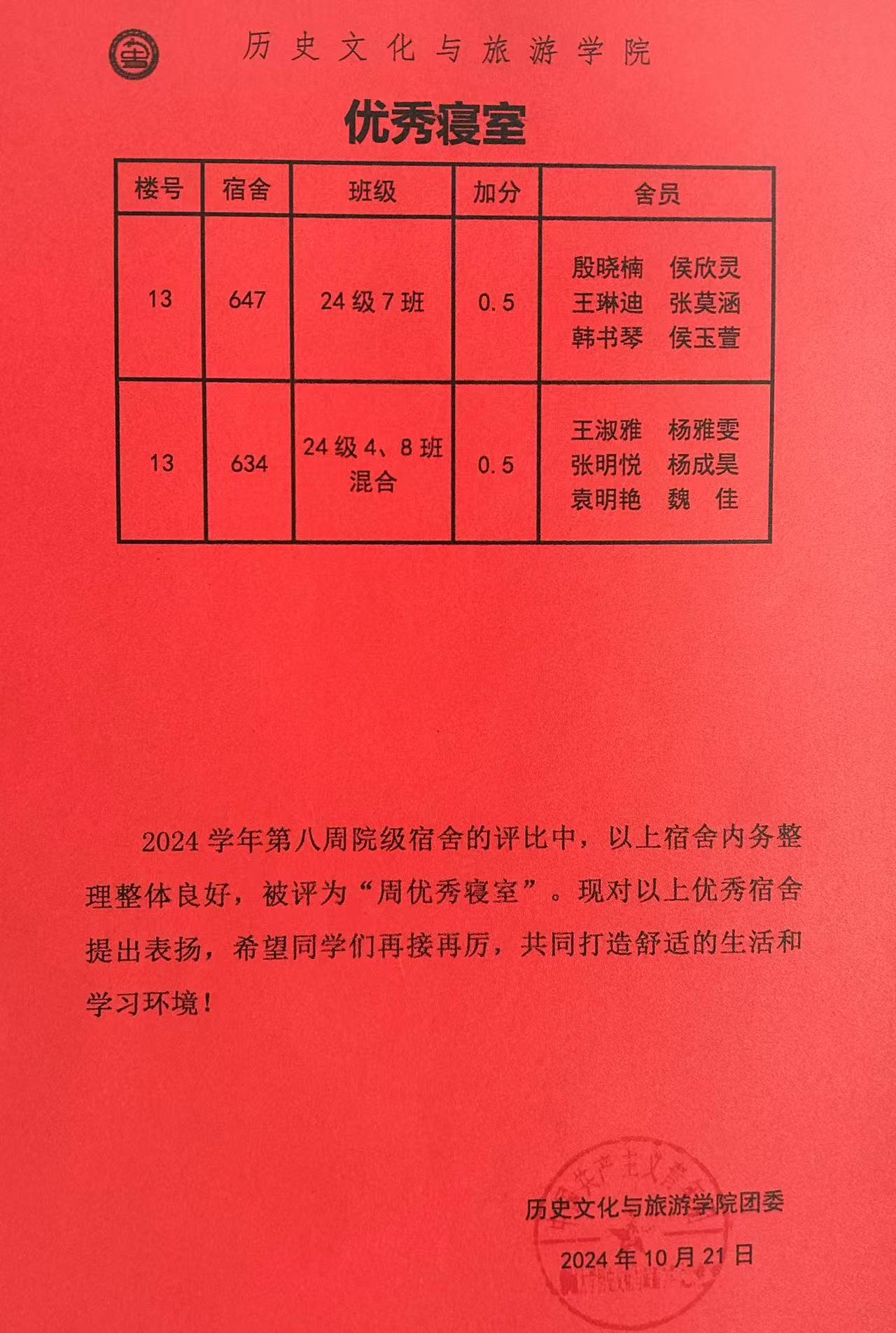 文明宿舍映风采,和谐环境展新颜。为营造整洁有序、温暖和谐、团结友善的宿舍环境,增强同学们的凝聚力,推动宿舍文化健康发展,第八周,公司于群星公寓开展“十佳寝室”评比活动。 本次宿舍评比活动的顺利进行,不仅有利于促进同学们养成良好的生活习惯,更有利于增强同学们的集体荣誉感和归属感,营造一个整洁、美观的宿舍环境。