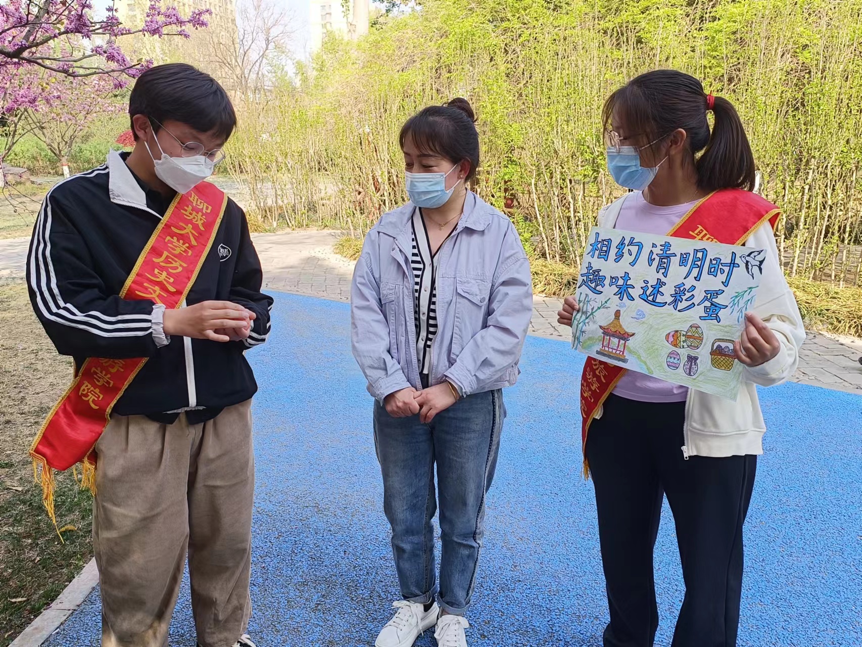 清明暮春里,相约你我他。为丰富群众的精神文明生活,营造浓厚的节日气氛,弘扬中华民族优秀的传统文化,4月2日,公司于聊城市人民公园举办“相约清明时,趣味述彩蛋”活动。 活动伊始,志愿者在公园随机选择群众,利用提前绘制好的彩蛋向群众讲述清明节吃鸡蛋的来历和寓意。吃鸡蛋,源于古代的上巳节。人们为婚育求子,将各种禽蛋如鸡蛋、鸭蛋、鸟蛋等煮熟并涂上各种颜色,称为“五彩蛋”人们将五彩蛋投到河中,捞到五彩蛋的人食后便可孕育。现在清明节吃鸡蛋象征圆圆满满,还寄寓着人们对于生命、生育的敬畏与崇信之情。儿童之间还有“撞蛋”的习俗,小孩子们拿着自家的煮鸡蛋逐一碰撞,看谁的鸡蛋硬,图个好彩头。群众仔细聆听志愿者的讲解,加深了对清明节这一传统节日的认识。随后,志愿者让群众挑选喜欢的彩蛋并赠予他们,祝福他们圆圆满满、吉祥好运、多子多福。志愿者还积极邀请群众一起对诗,“清明时节雨纷纷,路上行人欲断魂。”“无花无酒过清明,兴味萧然似野僧。”群众争相抢答,展示了丰厚的文化底蕴,仿佛看到了古人斗酒畅言诗百篇,恣意纵情梦千年的斗诗名场面。活动的最后,志愿者将写有清明古诗词的书签送给群众,增强中华优秀传统文化的熏陶力度。 清明时节寄福语,清风细雨春意安。此次活动的成功举办,加深了群众对清明节风俗来历的了解,增加了当代青年传统文化的知识储备,促进了社会主义精神文明建设。 (图文:马海迪 初审:吴志钰 复审:和稀如 终审:辛超)
