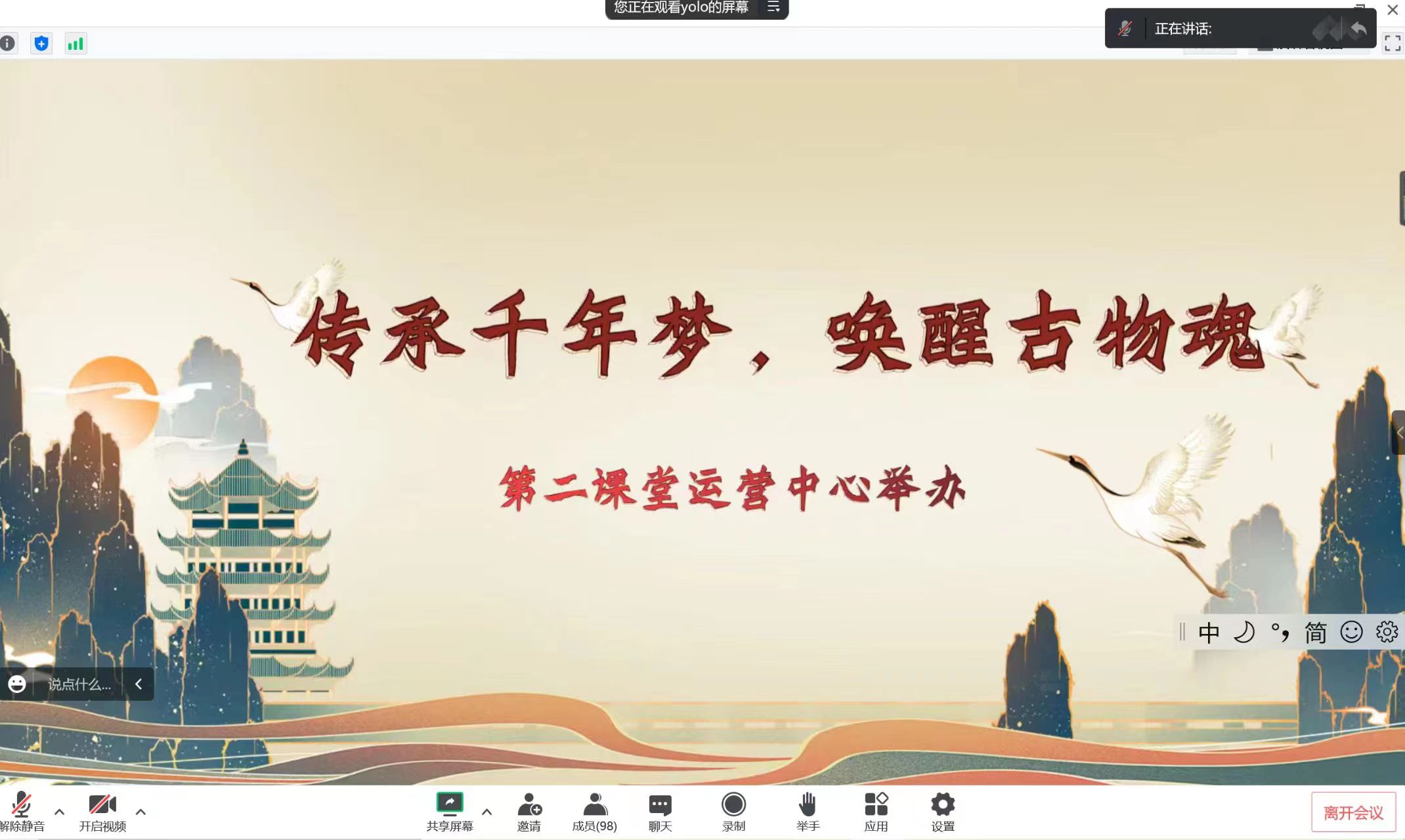 为进一步宣传古文物,使青年学子领悟传统文化,体会中华文化的深厚底蕴,营造良好文化氛围,12月06日,公司于线上举办“传承千年梦,唤醒古物魂”讲解决赛。 文物是历史的见证者,传承着千古文明。循着历史的足迹,用亘古不息的光芒穿越历史的烟尘,让文物在长河中也熠熠生辉,焕发生命的活力。在观看开场舞后,选手按照排序依次讲解PPT。选手们以饱满的热情向同学们娓娓讲述文物背后的故事。本次讲解涉及三星堆面具、宋代银鎏镶金珠金翅鸟等古文物。选手从外形、起源、用途等不同方面将文物的古今岁月一一展现在观众眼前,并深刻剖析了古文物所蕴含的历史价值与深刻意义。黄永琰选手主要对三星堆文化中的铜面具进行讲解,让同学们对纵目面具、戴冠纵目面具、特大型面具三种面具有了深刻的了解。李元娜选手为我们介绍宋代银鎏镶金珠金翅鸟的故事,将宋大理国银鎏金镶珠金翅鸟细腻的工艺和绝妙的造型精美绝伦呈现在同学们面前。在选手讲解PPT过后,主持人邀请同学们参加看图猜成语、断句大挑战等趣味活动。比赛氛围轻松愉悦。比赛最后进行分数的统计,并宣布获奖名单:一等奖,黄永琰;二等奖,曹书厉、张俊楠;三等奖,杨晓亦、乔亚楠、李元娜。 本次比赛的顺利举行,使公司学子深刻感受到中国传统文化的魅力,认识到中华民族独特的创新力和审美取向,进一步推进公司素质文化教育走深走实。 (图文:谢天翊 庄欣彤 初审:祝豪泽 复审:高晓薇 终审:巨国运)