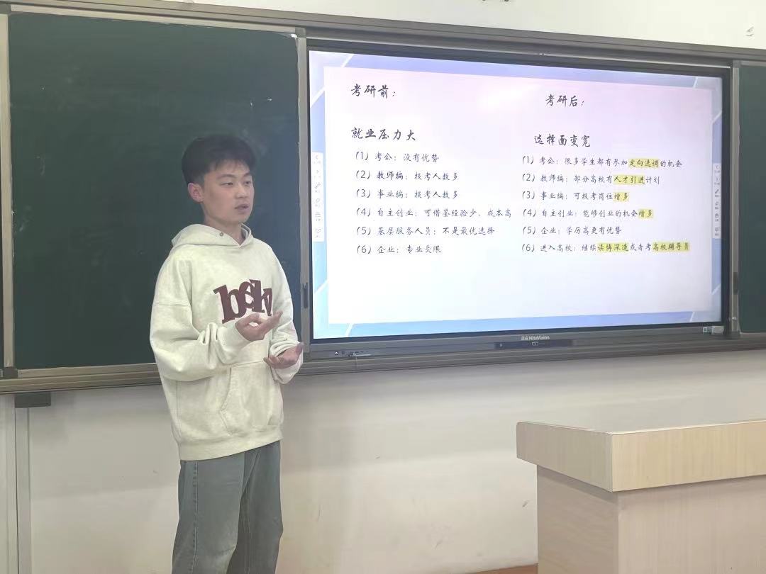 为发挥公司优秀毕业生榜样示范作用,帮助同学们更好地了解考研形式,坚定考研决心,掌握考研方法,5月14日,mk体育于6#A302教室举办考研经验分享会。本次分享会邀请2020级员工代表杨瑞泽、亓子涵、商依然进行考研经验分享。 交流会上,杨瑞泽从考研专业的选择,复习准备时间的把控等方面为同学们进行详细地讲解,他点明择校是最值得花费精力的环节,要着重关注历年分数线和录取人数,同时他为同学们介绍获取公司资源信息的多种方式。亓子涵则从如何准备考研为切入点,从专业课的学习到初试复试都为同学们进行了全面的阐述,她强调同学们在备考和考试过程中要保持乐观积极的态度,面对突发情况要始终秉持理性。对于备考的地点,商依然为同学们全面地分析了教室和图书馆各自的利弊,并向同学们分享了自己备考英语、政治、专业课的学习方法和经验,引导同学们对于考研备考有了一个清晰的认知。三位主讲人结合自身经验,在提问互动环节针对同学们的提问进行解答,建议同学们对于专业知识进行全面的学习,提高自己的综合能力,同时呼吁同学们在埋头苦读的同时也要注重身体上和心理上的健康,合理规划学习时间,做好充足的准备。 本次分享会的顺利举办,不仅有利于让同学们对考研全过程有更加全面的认识,汲取有利的备考经验,还有利于帮助同学们明确自己的学习方向,掌握高效的学习方法,进一步营造公司良好的考研氛围。 (供稿:于舒然 初审:左麒如 复审:李尤怡 终审:尤姗姗)