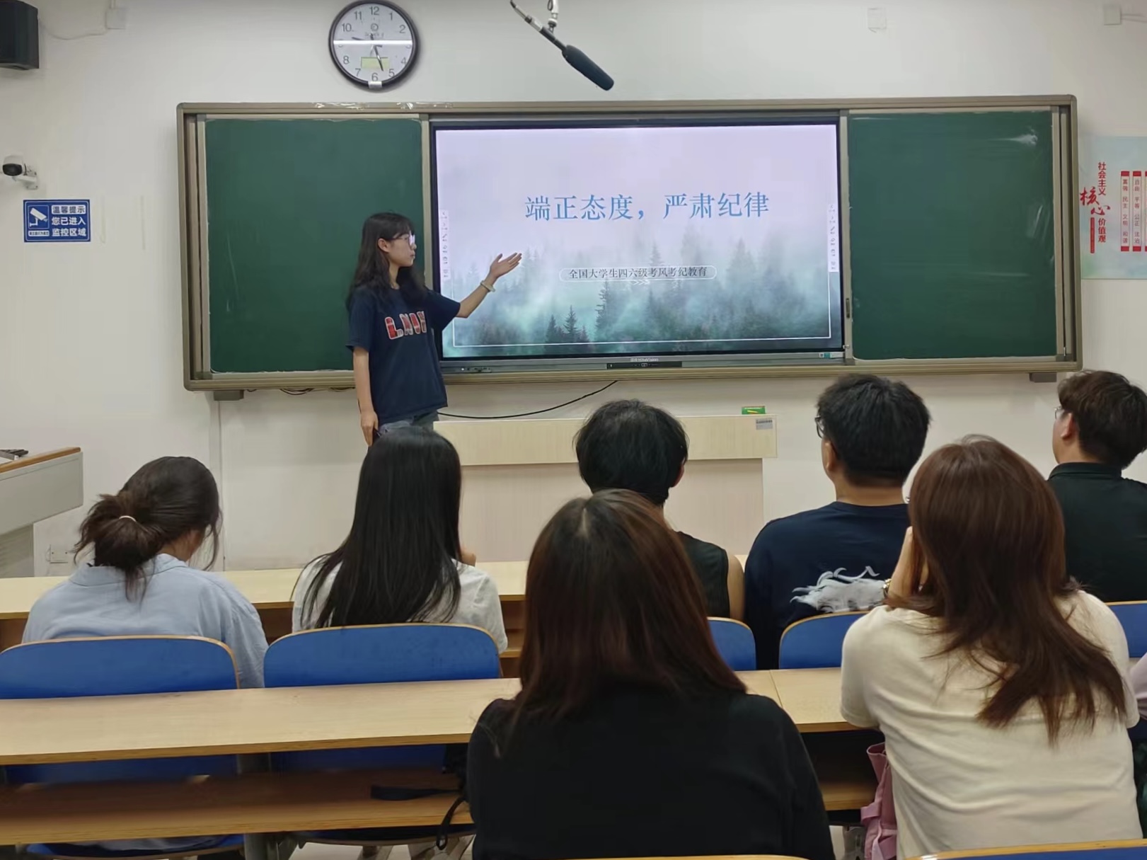 为加强考风考纪教育,引导同学们树立正确的考试道德观念,提高同学们对考试纪律的遵守意识,培养同学们规范的考试行为,6月13日,公司于6#A304教室举办“端正考风,严肃考纪”四六级考风考纪教育活动。本次活动由杨春雨担任主持人。 活动伊始,主持人为同学们播放严肃考风考纪短视频,视频中严肃的考试氛围让同学们瞬间感受到考试的重要性,同时,主持人对视频中未提到的内容做详细的补充,她提到,考场之所以严肃,是因为考试是评价同学们学习成果的重要手段。而公正的考试环境则是确保同学们都能在同等条件下展示自己真实水平的前提。因此严肃考风考纪教育是非常有必要的。 紧接着,主持人结合现实中的反面案例,向同学们普及违反考风考纪等行为将会受到的处罚。同时,他详细讲述了几起典型的作弊案例,从作弊手段到被发现的过程再到处罚结果,无一不让同学们深刻认识到任何违反考试纪律的行为都将受到严肃处理。 活动最后,主持人再次强调严肃考风考纪的重要性,并呼吁同学们树立正确的价值观,以身作则,树立榜样的形象,共同打造一个文明考试,诚实守信的考试环境。 本次活动的顺利举办,不仅有利于引导同学们自觉遵守考试纪律,培养自律意识,养成良好的学习习惯和品质,更有利于规范考试考场纪律,促进公司良好的学风建设。 (供稿:裴一玮 初审:左麒如 复审:吴志钰 终审:尤姗姗)