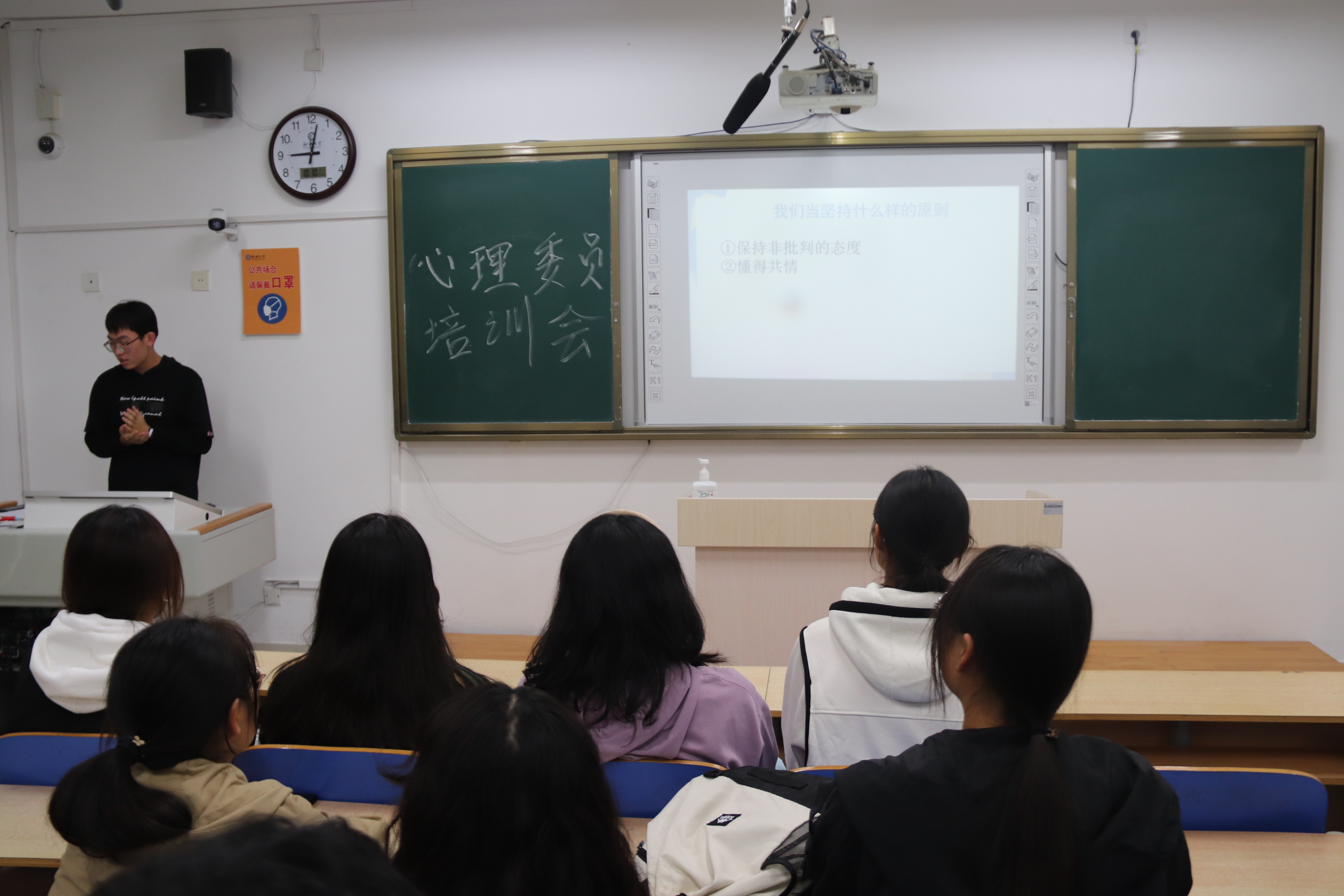 倡导和谐心态,成就健康心理。为帮助各班心理委员培养心理互助与自助意识,增强工作能力,掌握更多的心理健康知识,更好的服务同学,10月12日,公司于政史楼A303举办心理委员培训会,韩逸尘同学主持,全体21级和22级心理委员参加。 心理委员作为班级干部的一部分,负责本班心理健康知识的宣传普及,需要及时了解班级同学的心理状态,对其进行心理疏导。在这样的情况下,心理委员有必要具备一些必不可少的心理健康知识,以便更好地解决同学们的心理问题。韩逸尘同学通过PPT展示的方式向各班心理委员强调三方面的注意事项。首先,明确心理委员的含义,说明心理委员所要承担的责任以及所要具备的原则。作为一个非专业心理辅导者,心理委员要注重发现同学的心理异常现象,及时向辅导员老师反映,给予其力所能及的帮助。其次,韩逸尘同学针对具体事例展开分析,向大家介绍一些简单解决心理问题的方法。此外,他还指出,心理委员所要具备的一些基本技能,如设身处地地理解当事人感受、学会倾听他人的想法、具有较好的沟通能力等,这些都是作为一个心理委员所必不可少的条件。最后,韩逸尘同学向各位心理委员推荐《自卑与超越》、《朋辈心理辅导理论与技巧》等有关心理健康的书目,为心理委员们提供了具体提高心理健康技能的有效途径。 敞开心中一片天,放飞心理健康梦。此次活动的成功举办,不仅有利于增加心理委员对心理知识的了解,强化心理素质,而且有利于同学提升心理健康水平,增强心理素养,更好的应对学习与生活,对于推动心理健康教育工作,帮助更多同学化解心理压力,树立健康心理有着积极意义。 (图文初审:吴志钰 复审:高晓薇 终审:巨国运)