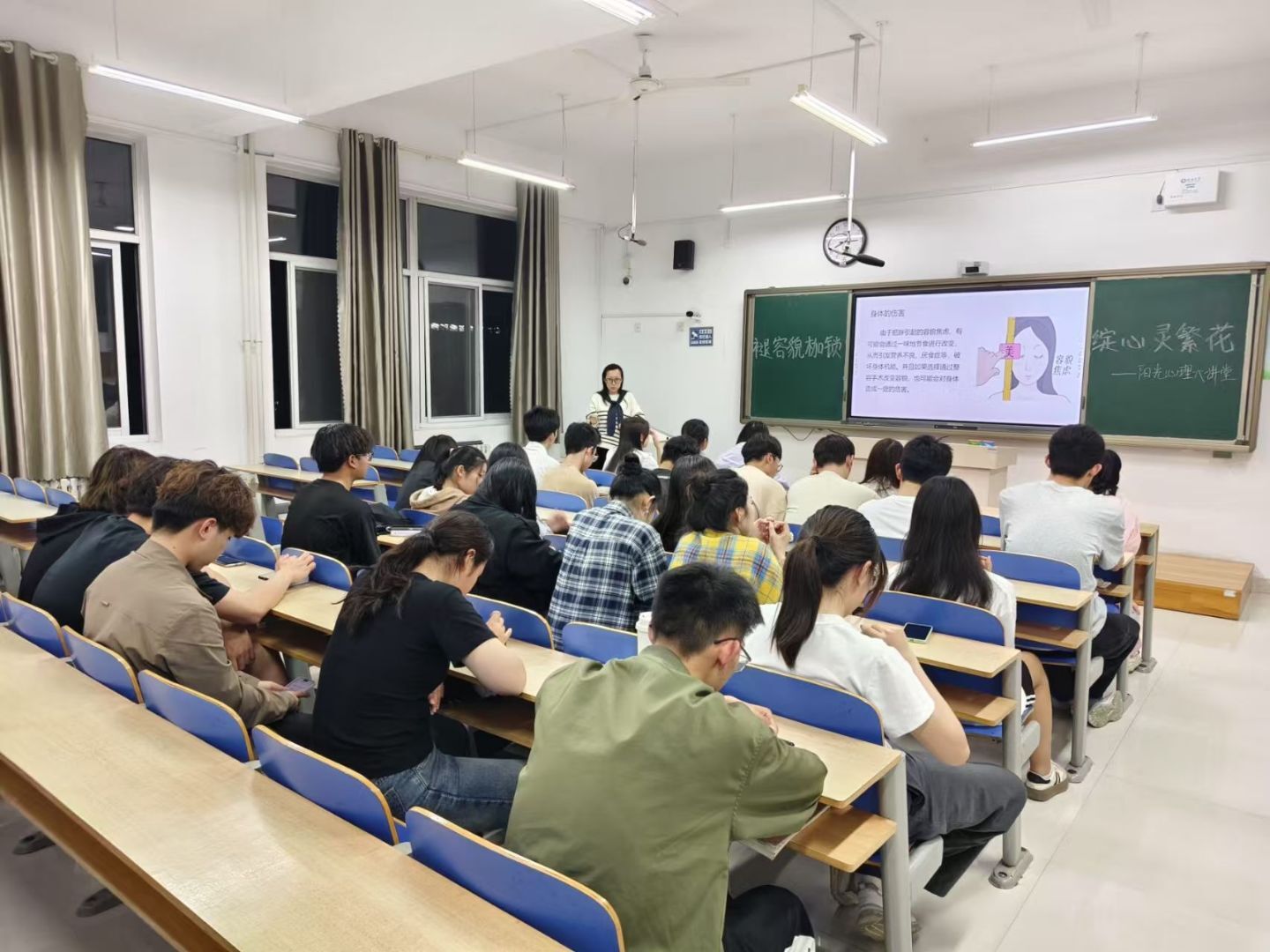 为引导同学们正确认识容貌焦虑,破除单一审美桎梏,提高他们的心理健康水平与生活质量,4月19日,我院于6#A305教室举办“褪容貌枷锁,绽心灵繁花”阳光心理大讲堂活动。活动邀请饶银萍老师担任主讲人。 饶银萍老师通过邀请两位同学在黑板上绘制自画像的互动方式,生动有趣地开启了本次讲座。这一开场形式不仅自然而然地引出了活动主题,更让现场师生距离迅速拉近。在随后的讲解中,饶银萍老师从专业心理学角度出发,系统剖析了容貌焦虑背后的形成机制。她指出,当前社交媒体通过算法推送形成的“网红审美”范式,正在构建封闭的审美认知体系,导致大众对美的理解日趋单一。为深化理解,饶银萍老师特别选取了具有代表性的社会热点案例,通过深入剖析,引导同学们认识到容貌焦虑背后的社会心理成因,激发他们对多元审美的深入思考。 在互动环节,饶银萍老师积极引导同学们分享个人经历,现场交流氛围热烈。在交流过程中,饶银萍老师还结合自身经历,以亲身体会和经验引导同学们打破容貌枷锁、拒绝容貌焦虑。对此,不少同学表示,通过此次活动他们不仅对自我价值有了更加深刻的认识,同时也对未来的学习与生活充满了信心和期待。 此次心理大讲堂的顺利举办,不仅有利于帮助同学们建立正确的自我认知,增强他们的心理韧性,更有助于营造积极健康的校园心理环境,为培养身心健全的新时代老员工奠定坚实的基础。 (供稿:王梦 朱紫藤 摄影:心理健康发展中心 初审:王舒心 复审:李月 终审:尤姗姗)