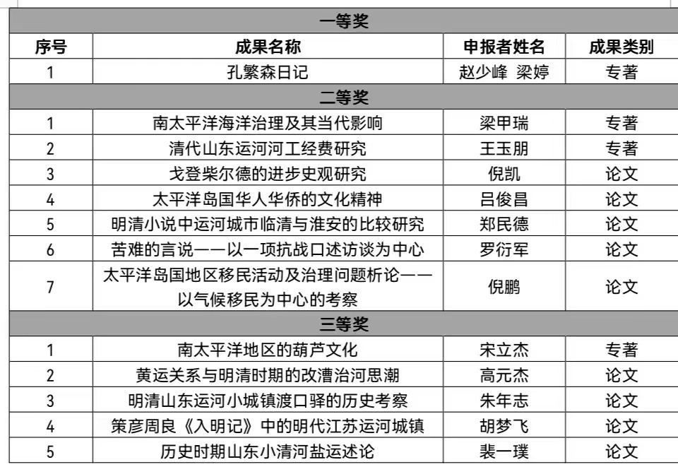 日前,聊城市第二十八届社会科学优秀成果奖评审结果公布,公司共13项成果获奖,其中一等奖1项,二等奖7项,三等奖5项,在获奖数量和层次上均取得新突破。 近年来,公司高度重视科研成果的培育和申报工作,强化引导科研创新和服务地方经济社会发展,陆续推出有新见、独见和深见的学术成果,科研实力不断提升。下一步,公司将进一步加大对科研项目和成果的培育力度,聚焦学科特色,充分发挥“太平洋岛国研究中心”、“运河学研究院”等平台优势,为建设发展mk体育特色哲学社会科学做出新的更大贡献。 聊城市社会科学优秀成果奖由聊城市委、市政府批准设置,每年评审一次,是全市社会科学研究的最高奖项。 获奖名单如下: (通讯员 巨国运)