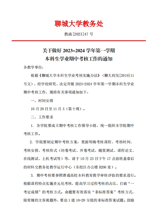 关于做好2023-2024学年第一学期本科生学业期中考核工作的通知