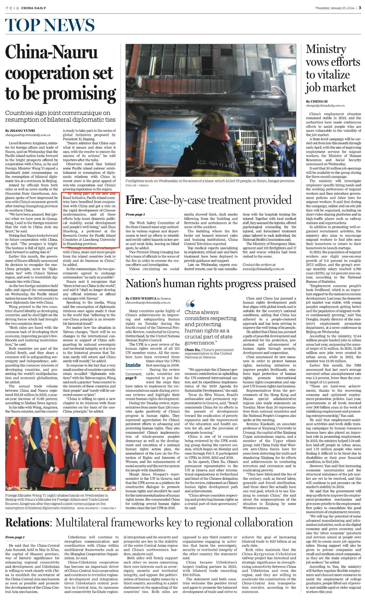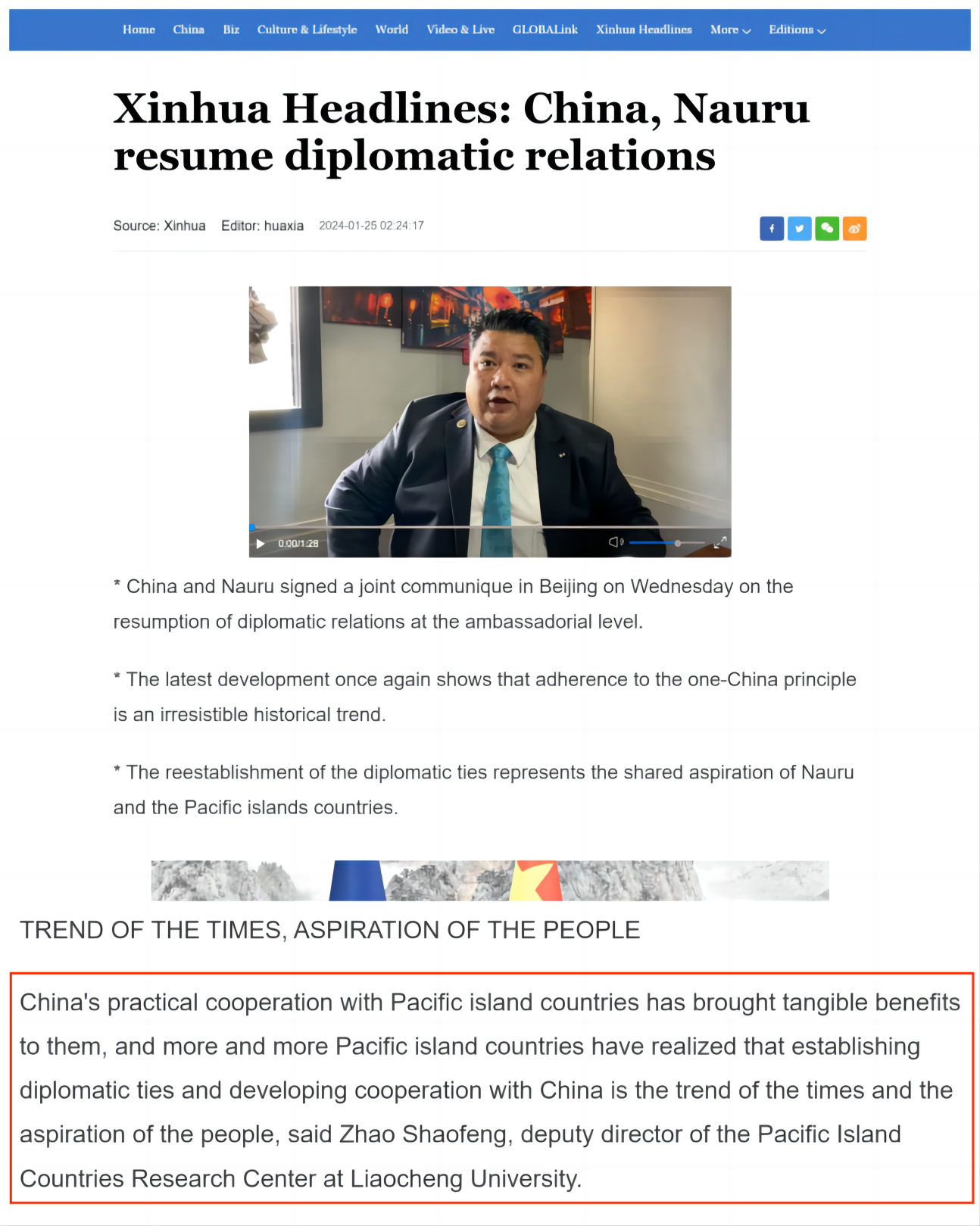 1月24日,中华人民共和国同瑙鲁共和国签署复交联合公报,瑙鲁成为中国第183个建交国。公司太平洋岛国研究中心赵少峰教授、于镭教授和倪鹏博士分别接受新华社、中国日报(China Daily)和中国国际电视台(CGTN)采访,就中瑙复交发表看法。 赵少峰教授在接受新华社、中国日报采访时表示,中国与太平洋岛国的务实合作给太平洋岛国带来了实实在在的利益,越来越多的太平洋岛国认识到与中国建交、发展合作是大势所趋、人心所向。 于镭教授就中瑙复交问题参加中国国际电视台The Point节目访谈。他认为,近年来中国与太平洋岛国共建“一带一路”,在中国的帮助下,巴新、瓦努阿图、所罗门群岛等国的基础设施建设得到提升,经济增长和就业率也有所改善,相信这一情况对瑙鲁也形成了良好的示范作用。 倪鹏博士在接受中国国际电视台China24栏目组直播连线时谈到,中国真心实意关注太平洋岛国发展。作为一个主权独立国家,瑙鲁与中国复交是基于自身发展和人民福祉作出的正确选择,符合国际法和国际关系基本准则。这再次表明了“一个中国”原则获国际社会普遍支持,不可阻挡。 (作者:倪鹏 审核:赵少峰)