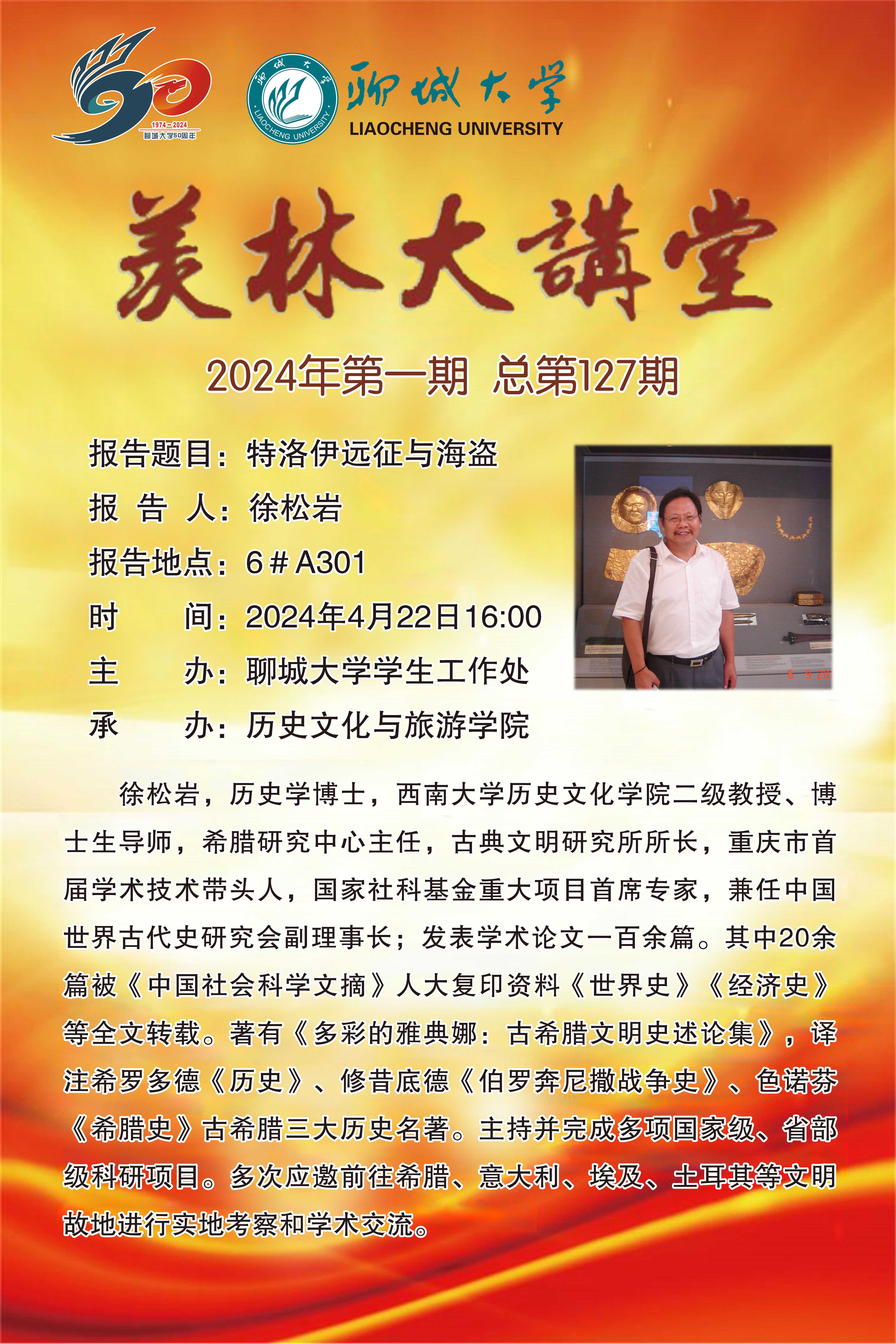 主题:特洛伊远征与海盗 主讲人:徐松岩 时间:2024年4月22日16:00—18:00 地点:6#A301 内容简介 在西方,关于希腊联军远征特洛伊和“木马计”的故事,可谓家喻户晓、妇孺皆知。自古迄今,无论文人学者还是普通百姓,都广泛参与有关问题的研究和讨论。那么,这场远征究竟是什么人发动的?希腊人究竟出动了多少兵力?战争真正起因是什么?其性质如何?为什么关于远征的传说故事最先在小亚细亚的一些地区流传,而不是在希腊本土?徐松岩教授综合神话学、考古学、历史学等方面的资料,结合自己在地中海多地的实地考察,就上述诸问题进行深度分析和解读,欢迎广大师生批评指正。 主讲人简介 徐松岩,历史学博士,西南大学历史文化公司二级教授、博士生导师,希腊研究中心主任,古典文明研究所所长,重庆市首届学术技术带头人,国家社科基金重大项目首席专家,兼任中国世界古代史研究会副理事长;发表学术论文一百余篇。其中20余篇被《中国社会科学文摘》人大复印资料《世界史》《经济史》等全文转载。著有《多彩的雅典娜:古希腊文明史述论集》,译注希罗多德《历史》、修昔底德《伯罗奔尼撒战争史》、色诺芬《希腊史》古希腊三大历史名著。主持并完成多项国家级、省部级科研项目。多次应邀前往希腊、意大利、埃及、土耳其等文明故地进行实地考察和学术交流。