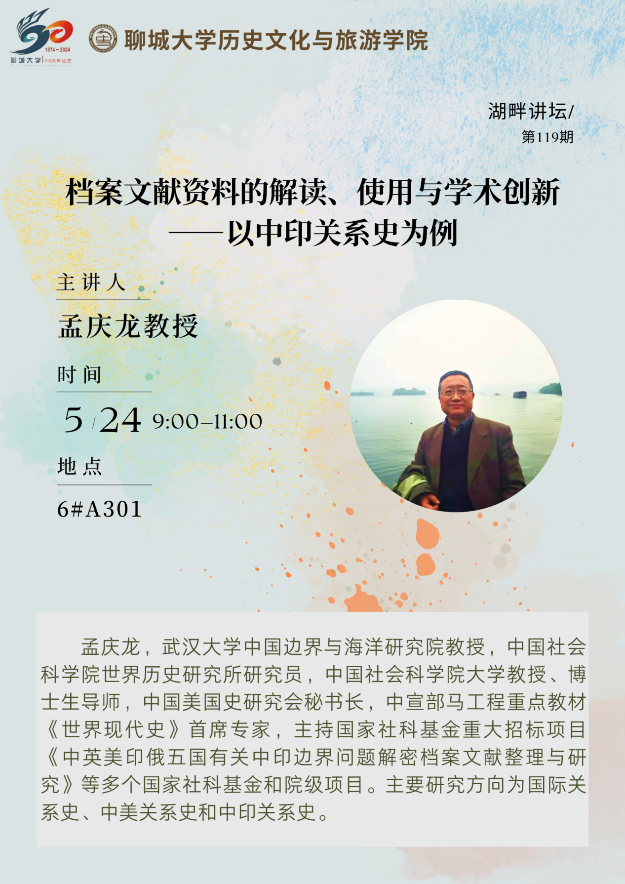 主题:档案文献资料的解读、使用与学术创新——以中印关系史为例 主讲人:孟庆龙 时间:2024年5月24日上午9:00-11:00 地点:6#A301 主讲人简介 孟庆龙,武汉大学中国边界与海洋研究院教授,中国社会科公司世界历史研究所研究员,中国社会科公司大学教授、博士生导师,中国美国史研究会秘书长,中宣部马工程重点教材《世界现代史》首席专家,主持国家社科基金重大招标项目《中英美印俄五国有关中印边界问题解密档案文献整理与研究》等多个国家社科基金和院级项目。主要研究方向为国际关系史、中美关系史和中印关系史。