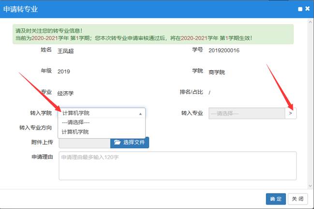4.在选择可选专业界面,点击查询按钮,选中要转入的专业,点击确定按钮