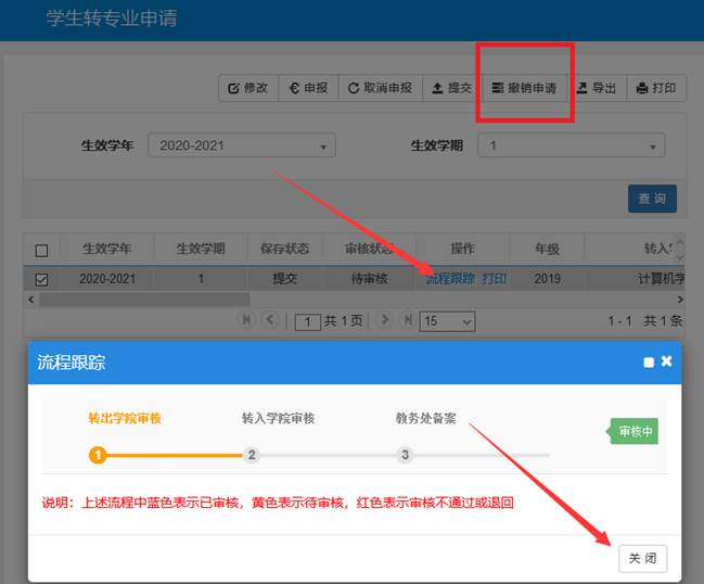 8.在员工转专业申请界面,可以点击流程跟踪链接,在弹出的界面上查看审核进度,若填报有误,在待审核状态下可以点击撤销申请按钮,撤销重新填报,一旦开始审核就不能再撤销重填了。