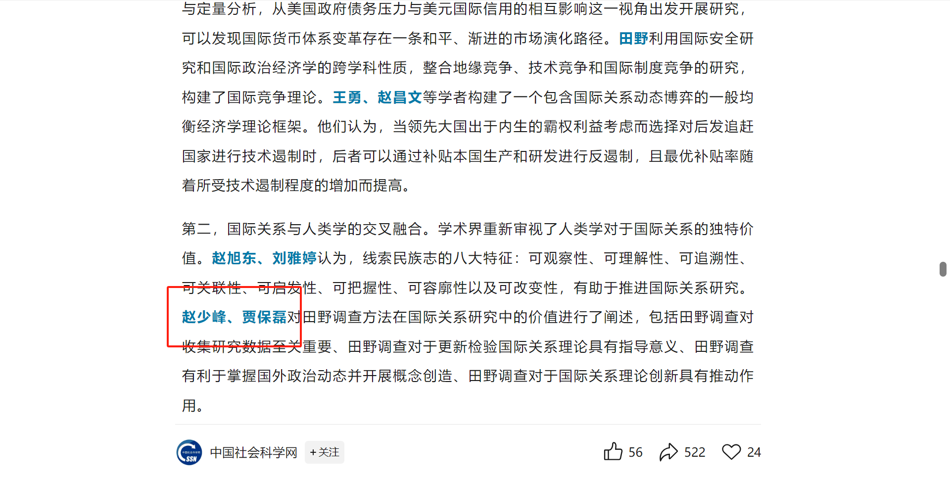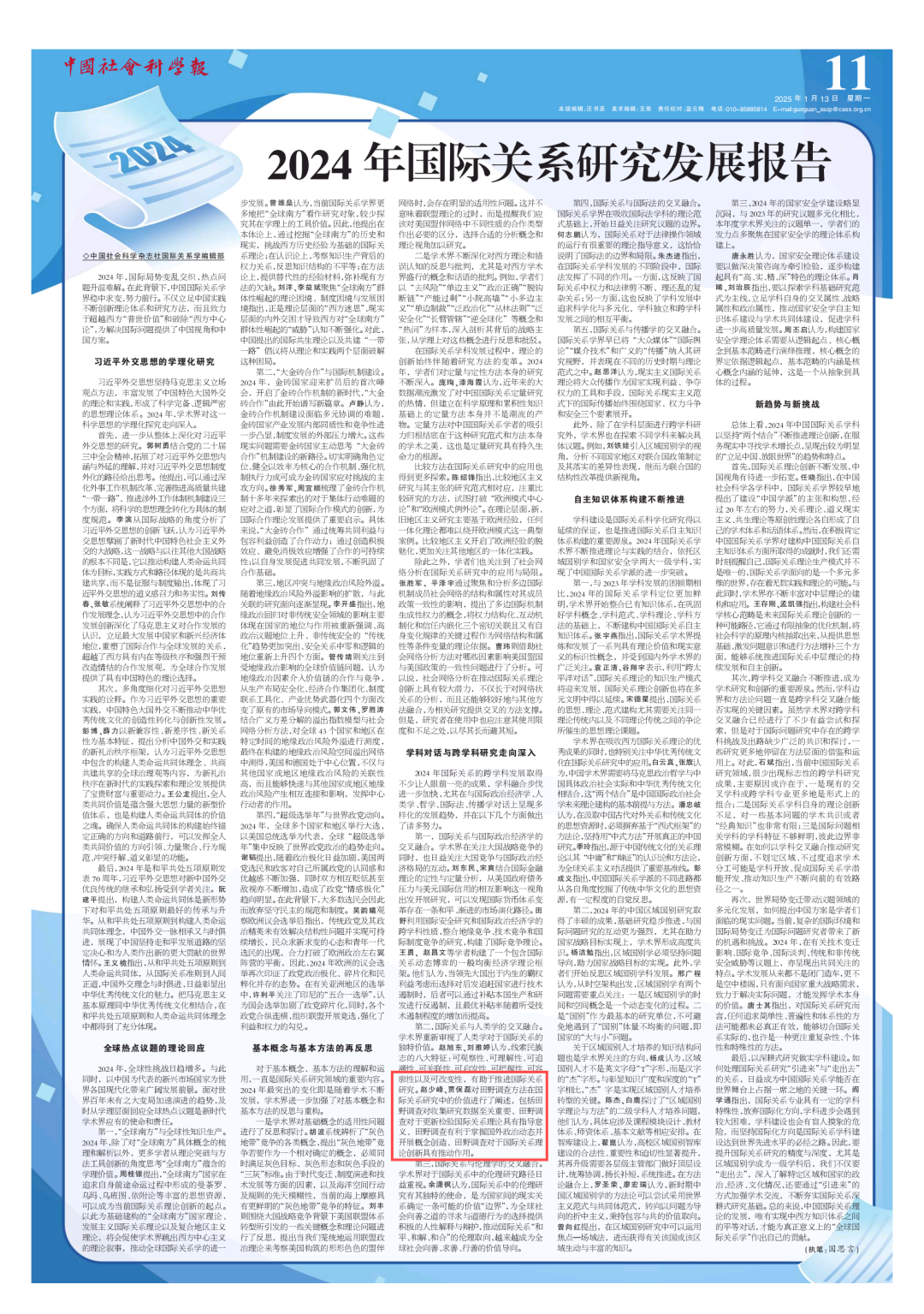 1月13日,《中国社会科学报》发布《2024年国际关系研究发展报告》(第11版)。该报告在“学科对话与跨学科研究走向深入”版块引用了公司赵少峰教授和贾保磊博士合著文章《人类学方法的国际关系研究价值》(刊发于《中国社会科学报》2024年11月26日第7版)上的观点。 文章指出田野调查方法在国际关系研究中具有重要价值。包括田野调查对收集研究数据至关重要、田野调查对于更新检验国际关系理论具有指导意义、田野调查有利于掌握国外政治动态并开展概念创造、田野调查对于国际关系理论创新具有推动作用。 此次公司教师文章观点被《2024年国际关系研究发展报告》引用,不仅展现了公司在区域国别研究领域的学术贡献,也进一步肯定了公司教师在助力交叉学科探索和人才培养方面的不懈努力。