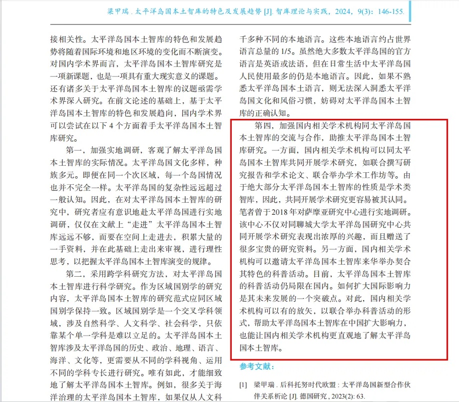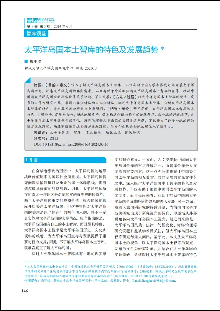 2025年5月28日至29日,第三次中国—太平洋岛国外长会在福建省厦门市举行,与会各方就中国同太平洋岛国关系及共同关心的议题深入交换意见,达成广泛共识,会议发表了《第三次中国—太平洋岛国外长会联合声明》,中方并梳理了落实第三次中国—太平洋岛国外长会共识举措清单。其中,第12条举措是智库对话:研究建立中国—太平洋岛国智库对话机制。 梁甲瑞在《智库理论与实践》(2024年第3期)发表的《太平洋岛国本土智库的特色及发展趋势》核心观点提出:加强国内相关学术机构同太平洋岛国本土智库的交流与合作,助推太平洋岛国本土智库研究。一方面,国内相关学术机构可以同太平岛国本土智库共同开展学术研究,如联合撰写研究报告和学术论文、联合举办学术工作坊等。由于绝大部分太平洋岛国本土智库的性质是学术类智库,因此,共同开展学术研究更容易被其认同。梁甲瑞曾于2018年对萨摩亚太平洋研究中心进行实地调研。该中心不仅对同mk体育太平洋岛国研究中心共同开展学术研究表现出浓厚的兴趣,而且赠送了很多宝贵的研究资料。另一方面,国内相关学术机构可以邀请太平洋岛国本土智库来华举办契合其特色的科普活动。目前,太平洋岛国本土智库的科普活动仍局限在国内。如何扩大国际影响力是其未来发展的一个突破点。对此,国内相关学 术机构可以有的放矢,以联合举办科普活动的形式,帮助太平洋岛国本土智库在中国扩大影响力,也能让国内相关学术机构更直观地了解太平洋岛国本土智库。 《智库理论与实践》(双月刊)是我国智库界专注于智库理论研究与智库实践创新相结合的高端专业学术期刊,2016 年2月28日创刊,由中国科公司文献情报中心与南京大学联合主办,2021年被中文社会科学引文索引CSSCI扩展版来源期刊收录,2022年被中国科技核心期刊收录,2023年被中国人文社会科学A刊引文数据库扩展期刊收录、被北京大学《中文核心期刊要目总览》(2023年版)收录,获得国家哲学社会科学文献中心2024年度管理学最受欢迎期刊。 在长期的建设和发展过程中,太平洋岛国研究中心聚焦“一带一路”倡议在太平洋岛国践行的重大需求,切实加强太平洋岛国基础研究,推动构建太平洋岛国研究领域学科体系、学术体系、话语体系。未来,太平洋岛国研究中心致力于通过新型智库研究推动中国对太平洋岛国相关政策的制定与完善,推动中国与太平洋岛国在各个相关领域的合作。