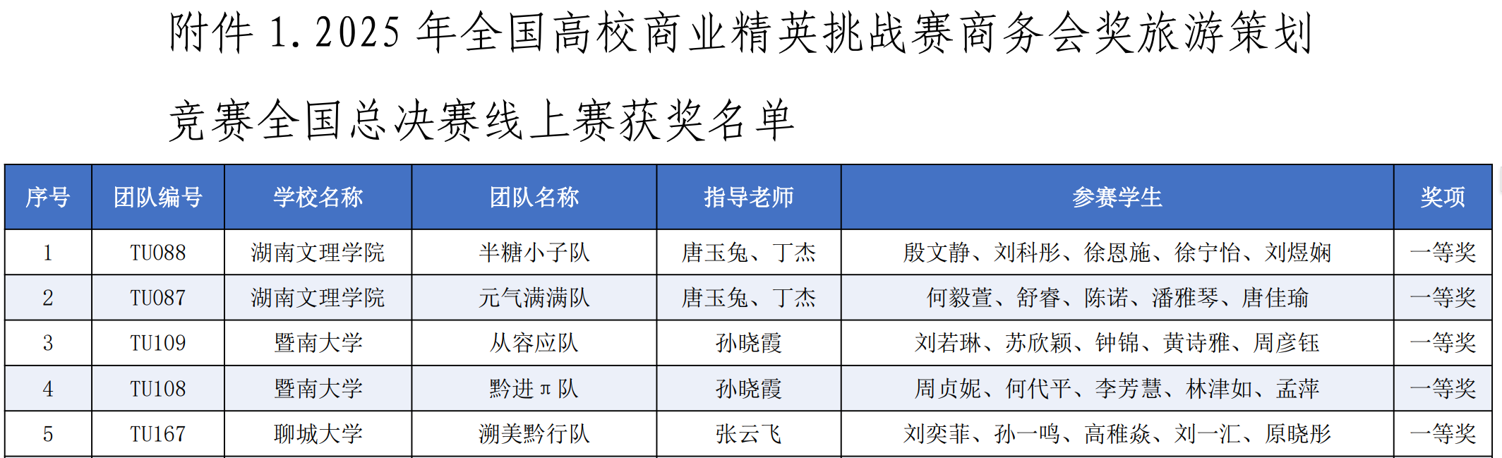 7月14日,2025年全国高校商业精英挑战赛商务会奖旅游策划竞赛全国总决赛获奖名单公布,公司学子凭借出色表现获得一等奖。 全国高校商业精英挑战赛商务会奖旅游策划竞赛聚焦商务会奖旅游领域,旨在推动行业创新发展,通过理论与实践深度融合的竞赛机制,培养具有创新思维和实战能力的高素质专业人才。本次大赛分为线上、线下两种参赛方式,公司参赛团队以校赛第一名、省赛一等奖进入全国总决赛线上赛,线下赛于6月20日-22日在浙江丽水古堰画乡旅游度假区举行。本次大赛线上参赛形式为提交“会奖旅游策划案+10分钟讲解视频”,公司参赛团队凭借扎实的专业功底、精湛的视频剪辑技术、创新的AIGC设计应用能力,以及生动出色的现场讲解,最终斩获全国总决赛一等奖。 选手风采(视频截图): 核心内容展示: 公司首次跻身此项竞赛便斩获佳绩,这一突破性成果不仅是对公司学子扎实专业功底与卓越创新实践能力的印证,更彰显了在人才培养领域的显著成效。旅游管理专业将坚守育人初心,以行业前沿需求为导向,持续深化专业教育与产业实践的精准融合,不断迭代升级实践教学体系。通过系统化的培养模式,致力于为文旅行业高质量发展输送更多既具备深厚理论素养,又拥有强劲实践创新能力的复合型应用人才。