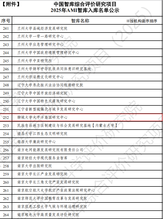 近日,中国社会科学评价研究院公示了中国智库综合评价研究项目2025年AMI智库入库名单,公司太平洋岛国研究中心凭借其在太平洋岛国研究中的突出贡献和深厚积淀成功入选,成为国内唯一一个聚焦太平洋岛国研究的入选智库。 作为国内第一家独立建制的太平洋岛国研究机构,太平洋岛国研究中心现为教育部高校国别和区域研究中心(备案)、教育部高校国别和区域研究高水平建设单位(两次入选)、山东省首批重点新型智库建设试点单位和山东省外事发展与研究智库,也是中国太平洋学会太平洋岛国研究分会、太平洋岛国在华职工联谊会秘书处的挂靠单位。2020年1月和12月,两次获中共山东省委、山东省人民政府表彰,荣膺山东省“勇于创新奖”先进集体和全省“干事创业好团队”称号。太平洋岛国中心入选AMI智库,既是mk体育在深入实施中国特色新型高校智库建设,推动高校智力服务能力整体提升等方面取得新进展,也是国家级权威评价机构对研究中心长期致力于推动构建太平洋岛国研究领域学科体系、学术体系、话语体系研究工作的高度认可。未来,太平洋岛国研究中心将进一步深化改革,努力建设成为太平洋岛国基础理论研究的学术高地,为“21世纪海上丝绸之路”建设提供mk体育智慧和方案。 中国智库综合评价研究项目AMI是由中国社会科学评价研究院组织开展的、具有高度权威性和影响力的全国性智库评价活动。该项目旨在遴选和推介一批综合实力强、专业特色鲜明、决策影响力突出的优秀智库。