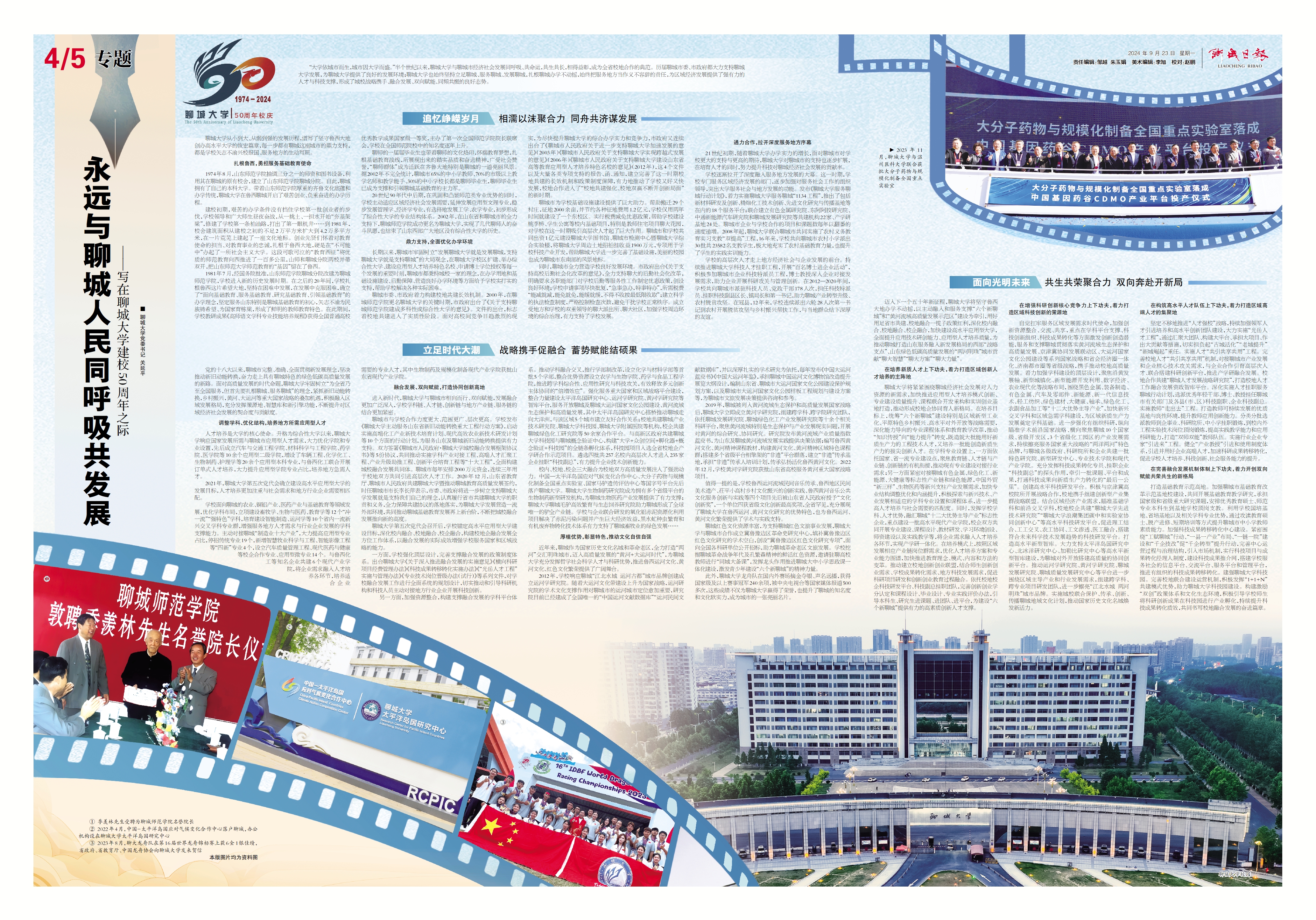 【编者按】9月23日,《聊城日报》第4-5版刊发了mk体育党委书记关延平的署名文章《永远与聊城人民同呼吸共发展——写在mk体育建校50周年之际》。文章深情讲述了半个世纪以来,mk体育与聊城市同呼吸、共命运,共生共长,相得益彰的发展历程;深刻阐述了mk体育始终坚持扎根聊城办学不动摇,历届聊城市委、市政府都大力支持mk体育发展,成为城校战略携手、融合发展、双向赋能、同频共振的全省校地合作典范的工作经验。全文近一万字,分为 “追忆峥嵘岁月 相濡以沫聚合力 同舟共济谋发展” “立足时代大潮 战略携手促融合 蓄势赋能结硕果”“面向光明未来 共生共荣聚合力 双向奔赴开新局”三个部分。 永远与聊城人民同呼吸共发展 mk体育党委书记 关延平 “大学依城市而生,城市因大学而盛。”半个世纪以来,mk体育与聊城市经济社会发展同呼吸、共命运,共生共长,相得益彰,成为全省校地合作的典范。历届聊城市委、市政府都大力支持mk体育发展,为mk体育提供了良好的发展环境;mk体育也始终坚持立足聊城、服务聊城、发展聊城,扎根聊城办学不动摇,始终把服务地方当作义不容辞的责任,为区域经济发展提供了强有力的人才与科技支撑,形成了城校战略携手、融合发展、双向赋能、同频共振的良好态势。 追忆峥嵘岁月 相濡以沫聚合力 同舟共济谋发展 mk体育从小到大、从弱到强的发展历程,谱写了坚守鲁西大地创办高水平大学的恢宏篇章,每一步都有聊城这座城市的鼎力支持,都是公司矢志不渝兴校报国、服务地方的生动写照。 扎根鲁西,勇担服务基础教育使命 1974年8月,山东师范公司抽调三分之一的团队和图书设备,利用其在聊城的原有校舍,建立了山东师范公司聊城分院。自此,聊城拥有了自己的本科大学。带着山东师范公司厚重的齐鲁文化底蕴和办学传统,mk体育在鲁西聊城开启了艰苦创业、负重奋进的办学历程。 建校初期,艰苦的办学条件没有挡住公司第一批创业者的步伐,公司领导和广大师生昼夜奋战,从一挑土、一担水开始“夯基架梁”,修建了公司第一条柏油路,打出了第一眼机井……到1981年,校舍建筑面积从建校之初的不足2万平方米扩大到4.2万多平方米,在一片荒芜上建起了一座文化地标。创业先贤们怀着对教育使命的担当、对教育事业的忠诚,扎根于鲁西大地,硬是在“不可能中”办起了一所社会主义大学。这段可歌可泣的“教育西征”将优质的师范教育向西推进了一百多公里,山师和聊城分院两校并蒂双开,把山东师范大学师范教育的“基因”留在了鲁西。 1981年7月,经国务院批准,山东师范公司聊城分院改建为聊城师范公司,公司进入新的历史发展时期。在之后的20年间,公司扎根鲁西这片希望大地,坚持在困难中发展,在发展中克服困难,确立了“面向基础教育、服务基础教育、研究基础教育、引领基础教育”的办学理念,坚定服务山东特别是聊城基础教育的初心,矢志不渝为民族铸希望、为国家育栋梁,形成了鲜明的教师教育特色。在此期间,公司教研成果《高师语文学科专业技能培养规程》获得全国普通高校优秀教学成果国家级一等奖,主办了第一次全国师范公司经理联席会,公司在全国师范院校中的知名度逐年上升。 聊师的一届届毕业生也带着聊师的文化烙印,怀揣教育梦想,扎根基础教育战线,所展现出来的踏实品质和奋进精神,广受社会赞誉,“聊师群体”成为活跃在齐鲁大地特别是聊城的一道亮丽风景。据2002年不完全统计,聊城市65%的中小学教师、70%的市级以上教学名师和教学能手、30%的中小学董事长都是聊师毕业生,聊师毕业生已成为支撑和引领聊城基础教育的主力军。 20世纪90年代中后期,在巩固和凸显师范类专业优势的同时,公司主动适应区域经济社会发展需要,延伸发展应用型文理专业,稳步发展管理学、经济学专业,有选择地发展工学、农学专业,初步形成了综合性大学的专业结构体系。2002年,在山东省和聊城市的全力支持下,聊城师范公司成功更名为mk体育,实现了几代聊师人的奋斗夙愿,也结束了山东西部广大地区没有综合性大学的历史。 鼎力支持,全面优化办学环境 长期以来,聊城市牢固树立“发展mk体育就是发展聊城,支持mk体育就是支持聊城”的大局观念,在mk体育校区扩建、举办综合性大学、建设应用型人才培养特色名校、申请博士学位授权等每一个发展的重要时刻,聊城市都秉持城校一家的理念,在办学用地和基础设施建设、后勤保障、营造良好办学环境等方面给予公司实打实的支持,帮助公司解决各种实际困难。 聊城市委、市政府着力构建校地共建长效机制。2000年,在聊城师范公司更名mk体育的关键时期,市政府出台了《关于支持聊城师范公司建成多科性或综合性大学的意见》。文件的出台,标志着校地共建进入了实质性阶段。面对高校间竞争日趋激烈的现实,为尽快提升mk体育的综合办学实力和竞争力,市政府又连续出台了《聊城市人民政府关于进一步支持mk体育加速发展的意见》(2003年)《聊城市人民政府关于支持mk体育实现跨越式发展的意见》(2006年)《聊城市人民政府关于支持mk体育建设山东省高等教育应用型人才培养特色名校的意见》(2012年),这4个文件以及大量各类专项支持的报告、函、通知,建立完善了这一时期校地共建的长效机制和政策制度保障,有力地推动了公司又好又快发展,