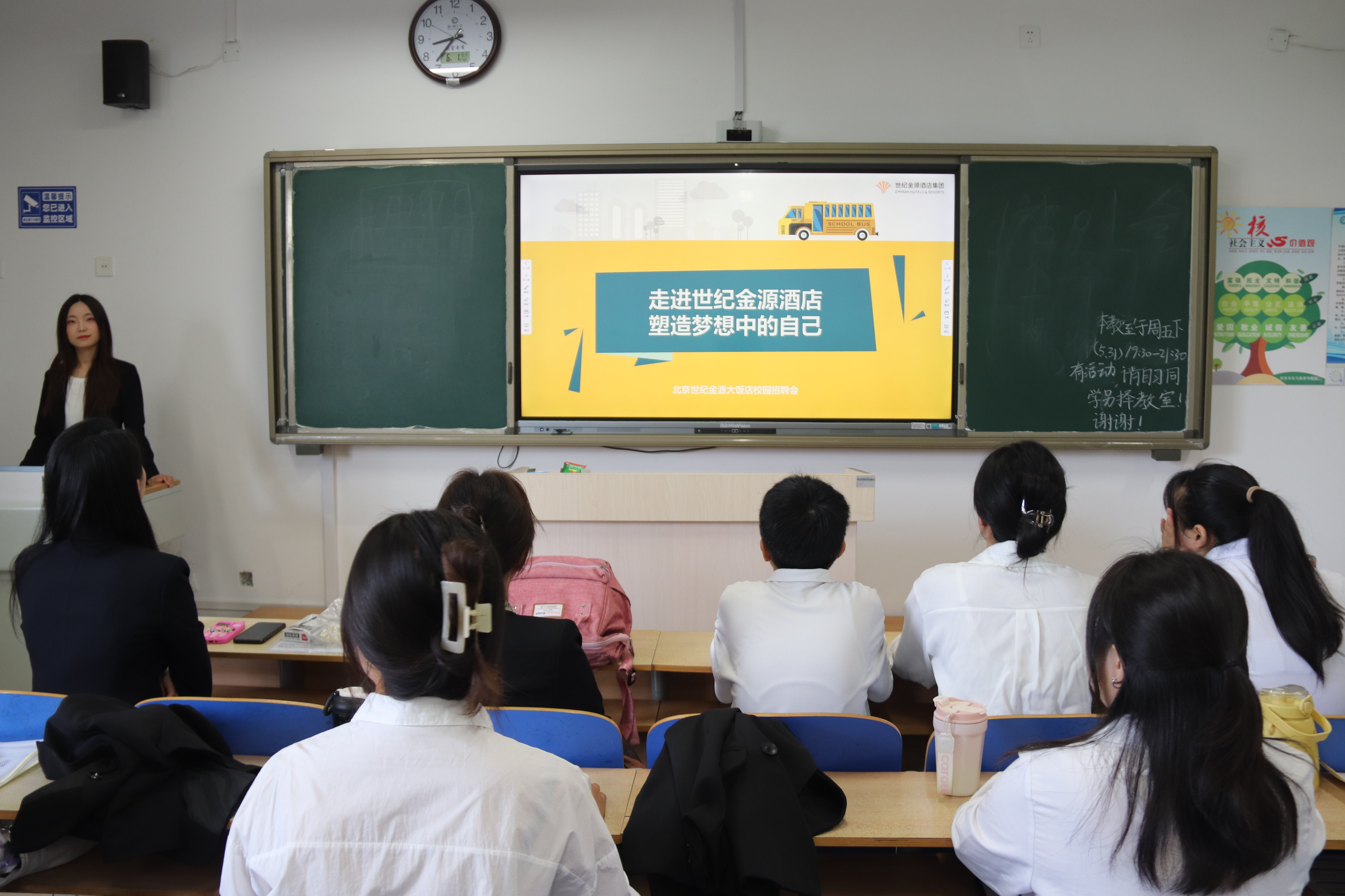 为帮助同学们更加清晰认识到自己的职业兴趣和发展方向,进行更加准确地职业规划,提升自己的实践能力和综合素质,6月3日,公司于6#A404举办企业宣讲会。世纪金源大饭店刘贝茜、上海客莱福诺富特酒店徐蓉代表参会。 会议初始,刘贝茜为同学们播放世纪金源大饭店宣传视频,通过生动的视频向同学们介绍了集团的历史、规模以及涉及的领域,包括酒店文旅,生活服务以及大健康等赛道,展现了集团的多元化和广泛的影响力,引起了不少同学的就业热情。在问答互动环节,刘贝茜针对宣传视频内容提问同学们,并分享实习待遇与环境见解,鼓励同学们积极参加面试,使同学们对世纪金源大饭店有了全方位的认知。随后,徐蓉详细地阐述了上海客莱福诺富特酒店在激烈市场竞争中的显著优势以及为实习生提供的优厚待遇。她强调,客莱福诺富特酒店坐落于上海浦东,位于经济蓬勃发展的核心区域,交通便利,为员工的通勤提供了极大的便捷。同时,无论是餐饮、住宿、出行还是休闲娱乐,这里都能提供一应俱全的便利服务,表明酒店能为同学们提供丰富的学习机会及发展空间,鼓励同学们积极投递简历。此外,徐蓉还结合过往实习生的真实经历,耐心细致地剖析了实习过程中可能遇到的各类问题,并提供了相应的解决方案。整个会议过程中,氛围和谐融洽,互动交流频繁。最后,主讲人呼吁同学们保持开放的心态,勇于尝试新的领域和挑战,不断拓宽自己的视野和能力。把握这次难得的机会,将所学与实践相结合,为未来职业发展打下坚实的基础。 本次宣讲会的顺利举办,不仅有利于增进同学们对企业文化的了解,拓宽职业视野,更有利于搭建起企业与同学们之间的桥梁,促进双方的交流与合作,从而推动公司优秀学子的实习与就业。 (供稿:裴一玮 初审:左麒如 复审:吴志钰 终审:尤姗姗)